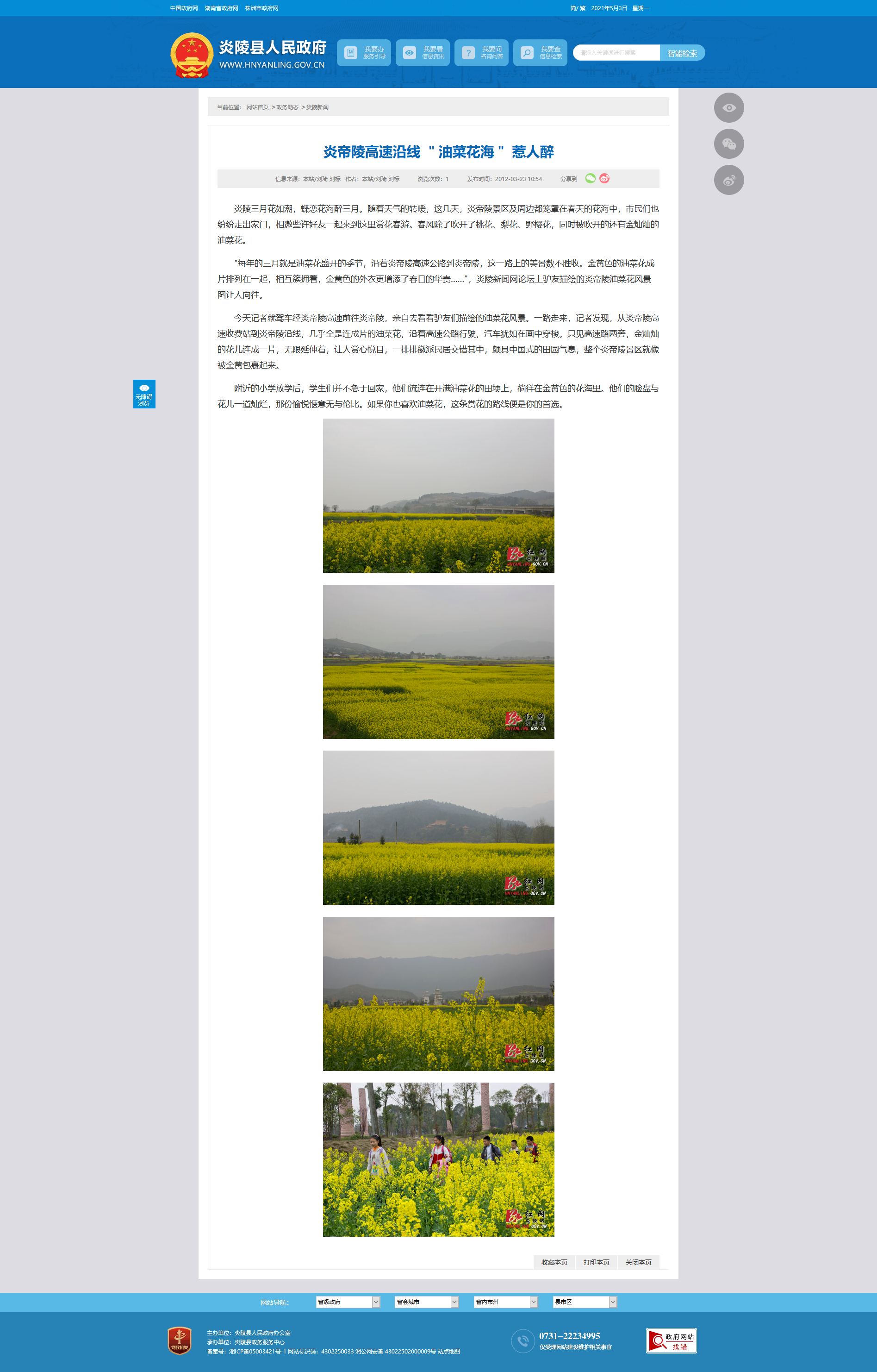 "每年的三月就是油菜花盛开的季节,沿着炎帝陵高速公路到炎帝陵,这一路上的美景数不胜收。金黄色的油菜花成片排列在一起,相互簇拥着,金黄色的外衣更增添了春日的华贵……",炎陵新闻网论坛上驴友描绘的炎帝陵油菜花风景图让人向往。