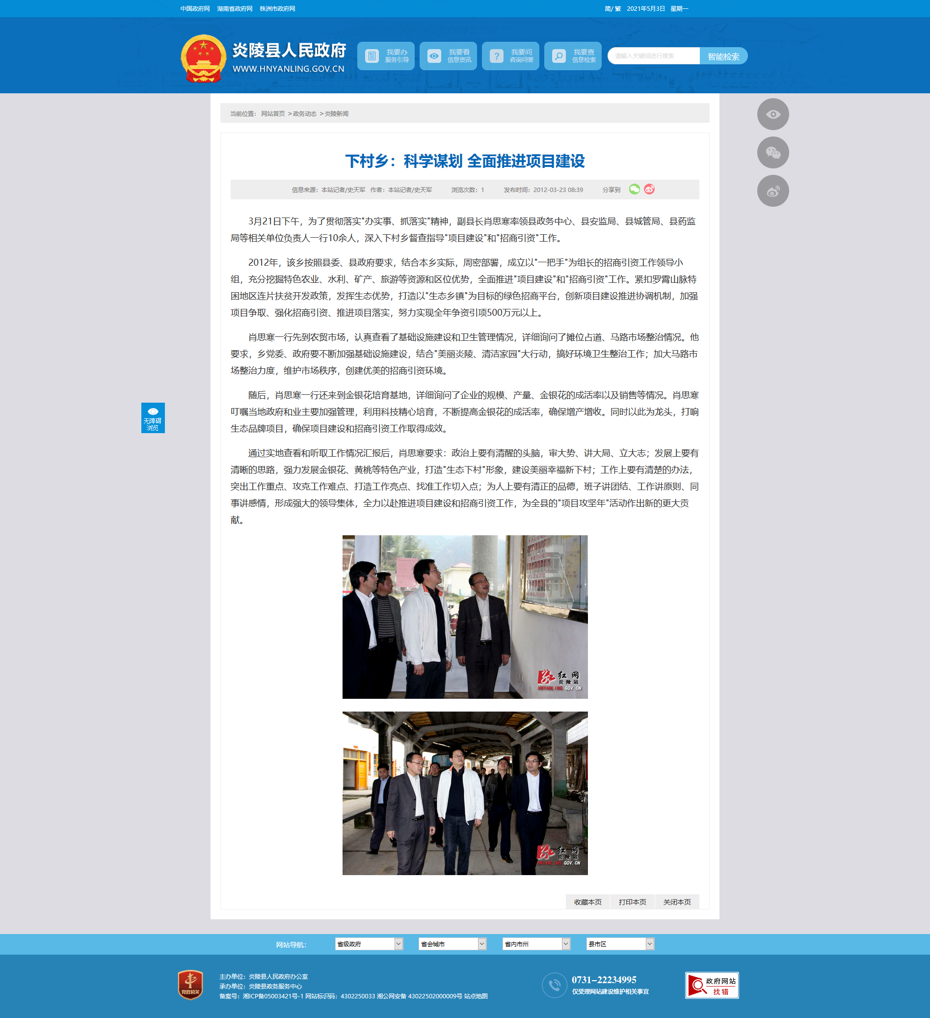 3月21日下午,为了贯彻落实"办实事、抓落实"精神,副县长肖思寒率领县政务中心、县安监局、县城管局、县药监局等相关单位负责人一行10余人,深入下村乡督查指导"项目建设"和"招商引资"工作。