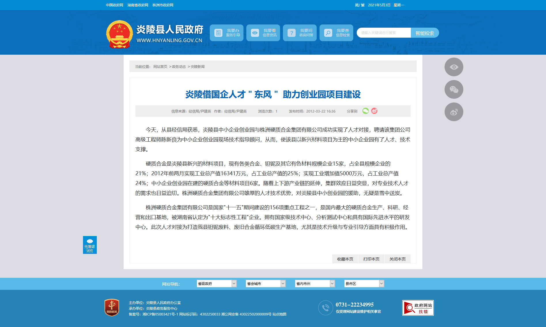 今天,从县经信局获悉,炎陵县中小企业创业园与株洲硬质合金集团有限公司成功实现了人才对接,聘请该集团公司高级工程师陈新良为中小企业创业园现场技术指导顾问,从而,使该县以新兴材料项目为主的中小企业园有了人才、技术支撑。
