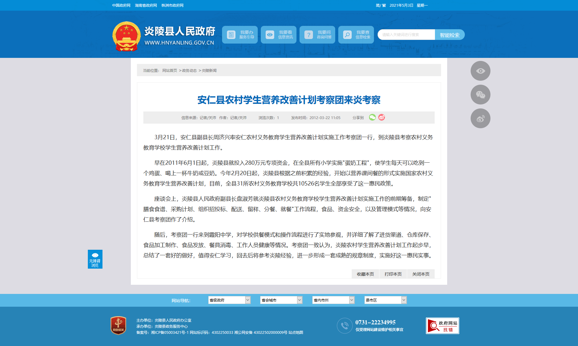 3月21日,安仁县副县长周济兴率安仁农村义务教育学生营养改善计划实施工作考察团一行,到炎陵县考察农村义务教育学校学生营养改善计划工作。
