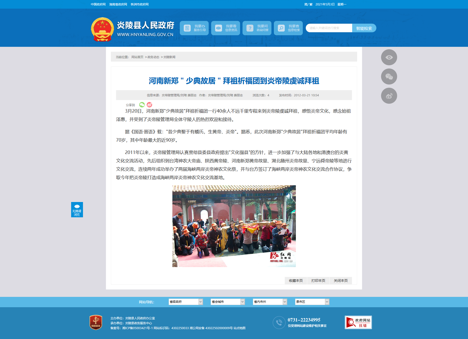 3月20日,河南新郑"少典故居"拜祖祈福团一行40余人不远千里专程来到炎帝陵虔诚拜祖,感悟炎帝文化,感念始祖泽惠,并受到了炎帝陵管理局全体守陵人的热烈欢迎和接待。