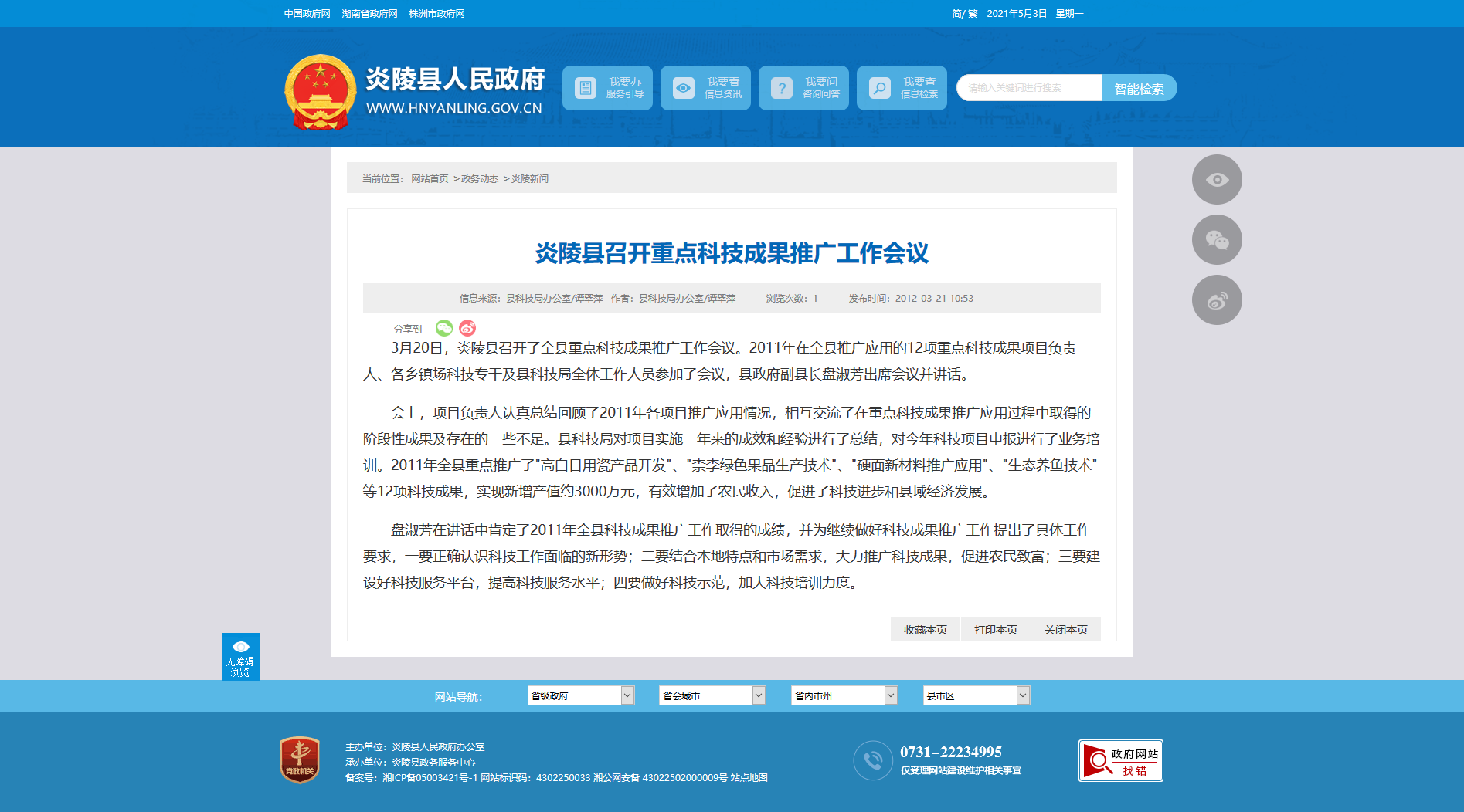 3月20日,炎陵县召开了全县重点科技成果推广工作会议。2011年在全县推广应用的12项重点科技成果项目负责人、各乡镇场科技专干及县科技局全体工作人员参加了会议,县政府副县长盘淑芳出席会议并讲话。