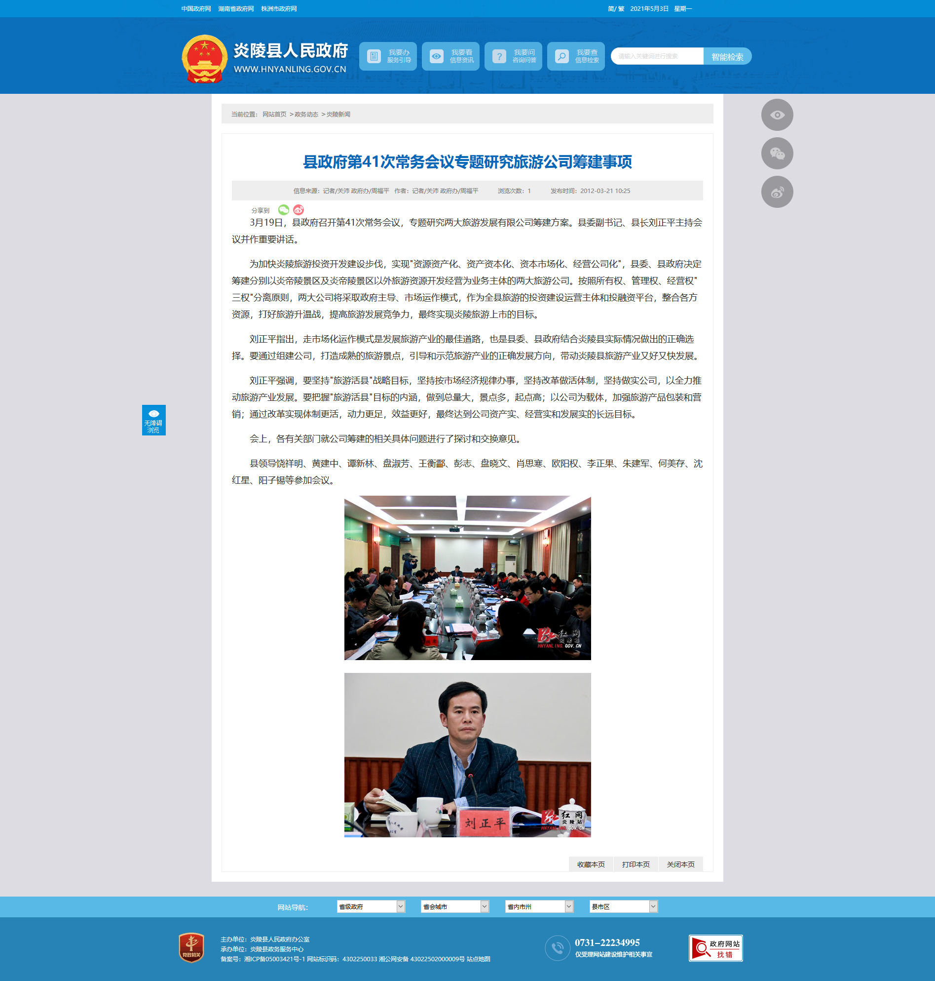 3月19日,县政府召开第41次常务会议,专题研究两大旅游发展有限公司筹建方案。县委副书记、县长刘正平主持会议并作重要讲话。