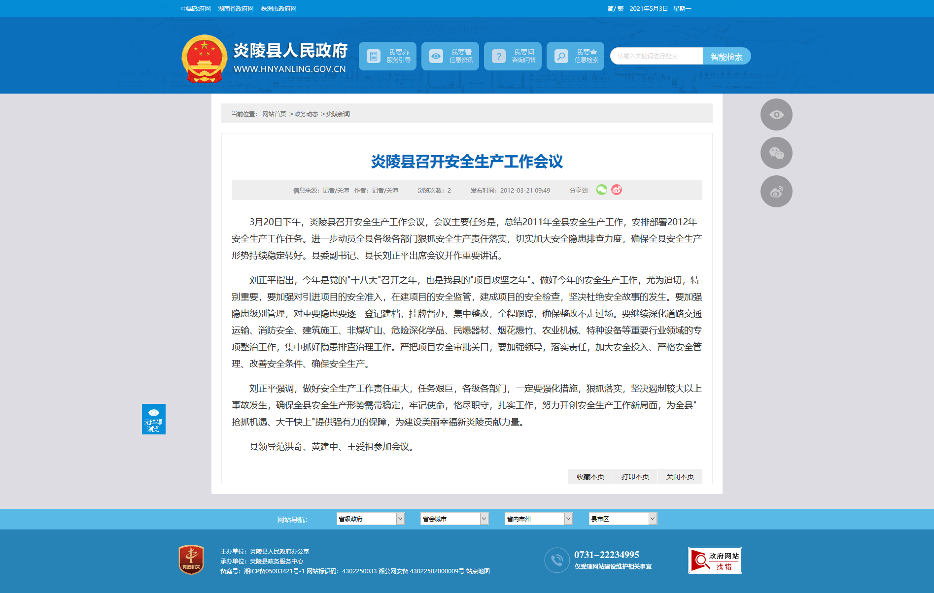 3月20日下午,炎陵县召开安全生产工作会议,会议主要任务是,总结2011年全县安全生产工作,安排部署2012年安全生产工作任务。进一步动员全县各级各部门狠抓安全生产责任落实,切实加大安全隐患排查力度,确保全县安全生产形势持续稳定转好。县委副书记、县长刘正平出席会议并作重要讲话。