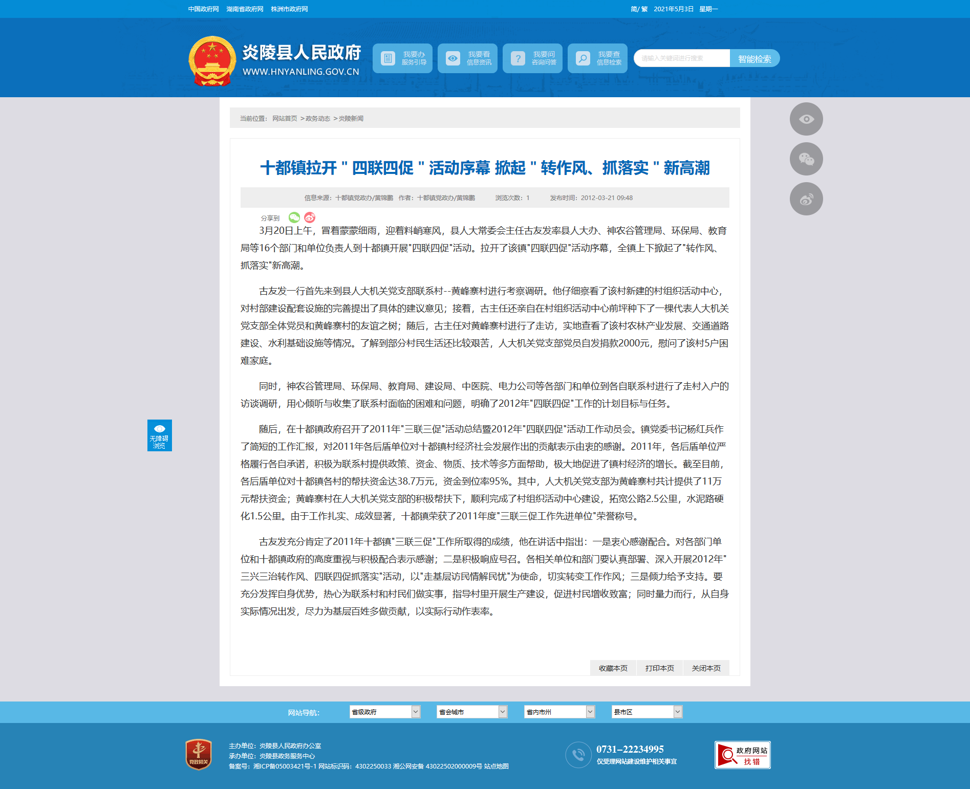 3月20日上午,冒着蒙蒙细雨,迎着料峭寒风,县人大常委会主任古友发率县人大办、神农谷管理局、环保局、教育局等16个部门和单位负责人到十都镇开展"四联四促"活动。拉开了该镇"四联四促"活动序幕,全镇上下掀起了"转作风、抓落实"新高潮。