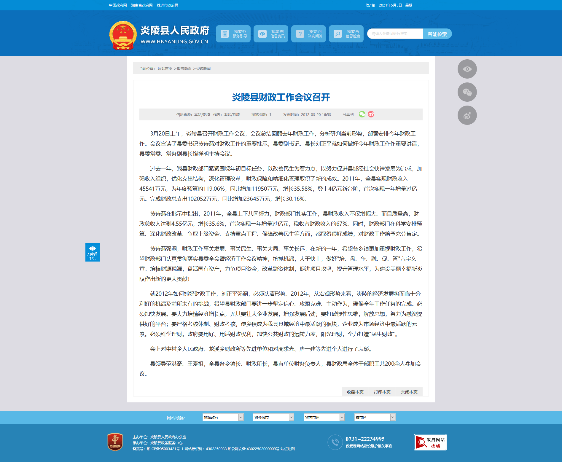 3月20日上午,炎陵县召开财政工作会议,会议总结回顾去年财政工作,分析研判当前形势,部署安排今年财政工作。会议宣读了县委书记黄诗燕对财政工作的重要批示,县委副书记、县长刘正平就如何做好今年财政工作作重要讲话,县委常委、常务副县长饶祥明主持会议。