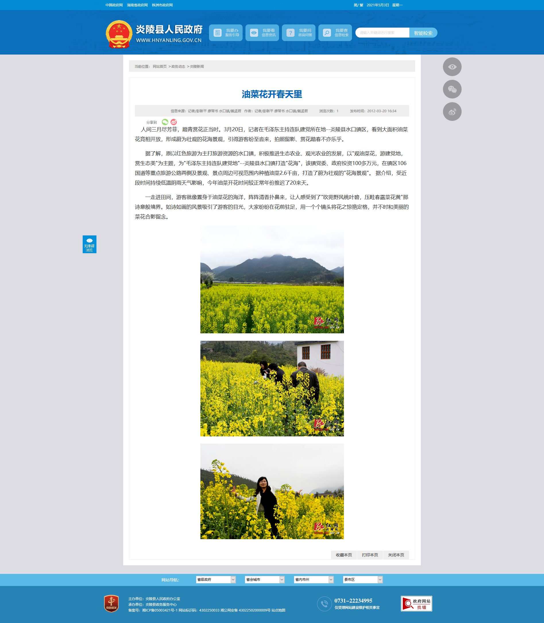 据了解,原以红色旅游为主打旅游资源的水口镇,积极推进生态农业、观光农业的发展,以"观油菜花,游建党地,赏生态美"为主题,为"毛泽东主持连队建党地"--炎陵县水口镇打造"花海",该镇党委、政府投资100多万元,在镇区106国道等重点旅游公路两侧及景观、景点周边可视范围内种植油菜2.6千亩,打造了蔚为壮观的"花海景观"。 据介绍,受近段时间持续低温阴雨天气影响,今年油菜开花时间较正常年份推迟了20来天。