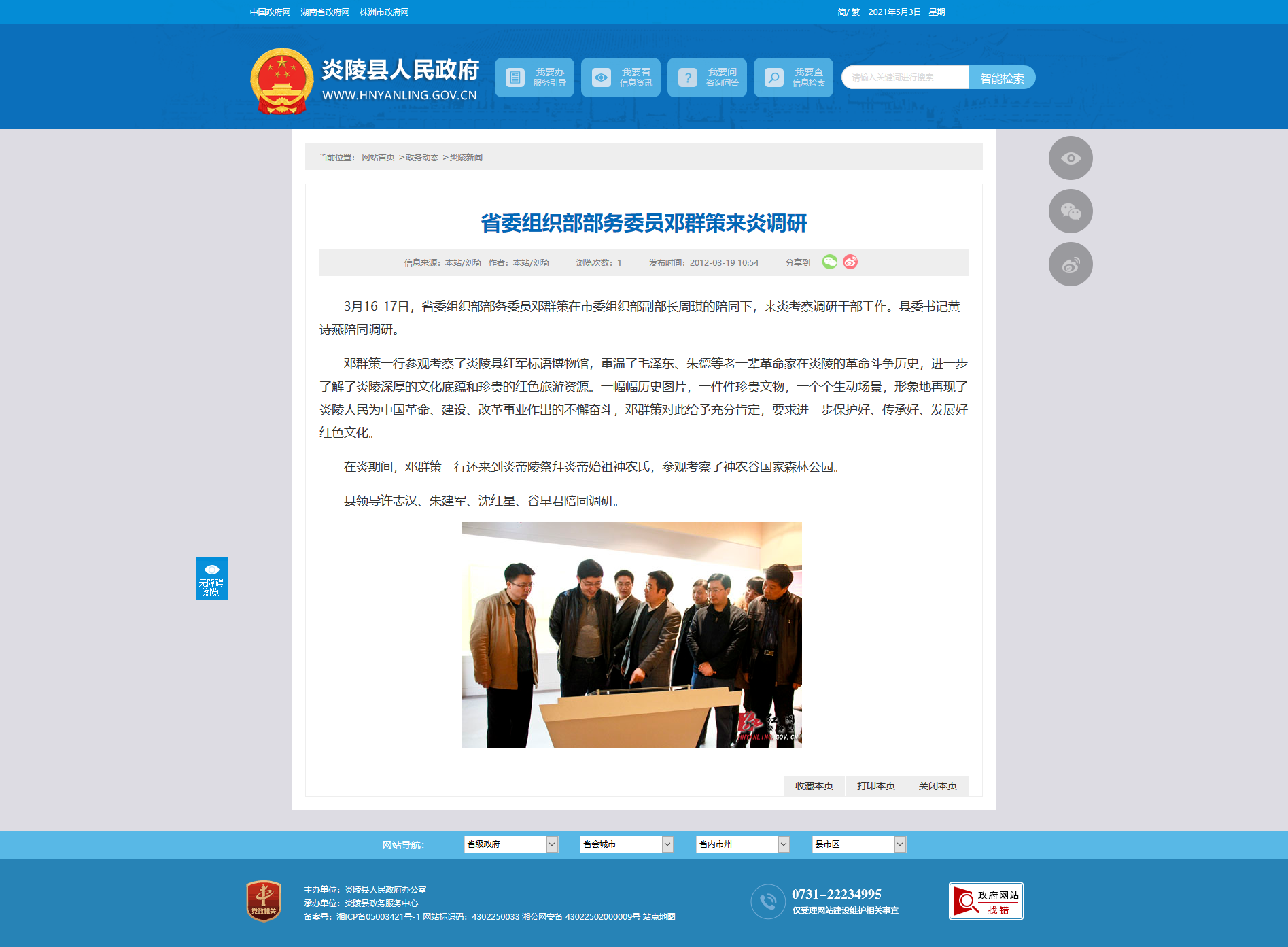 3月16-17日,省委组织部部务委员邓群策在市委组织部副部长周琪的陪同下,来炎考察调研干部工作。县委书记黄诗燕陪同调研。