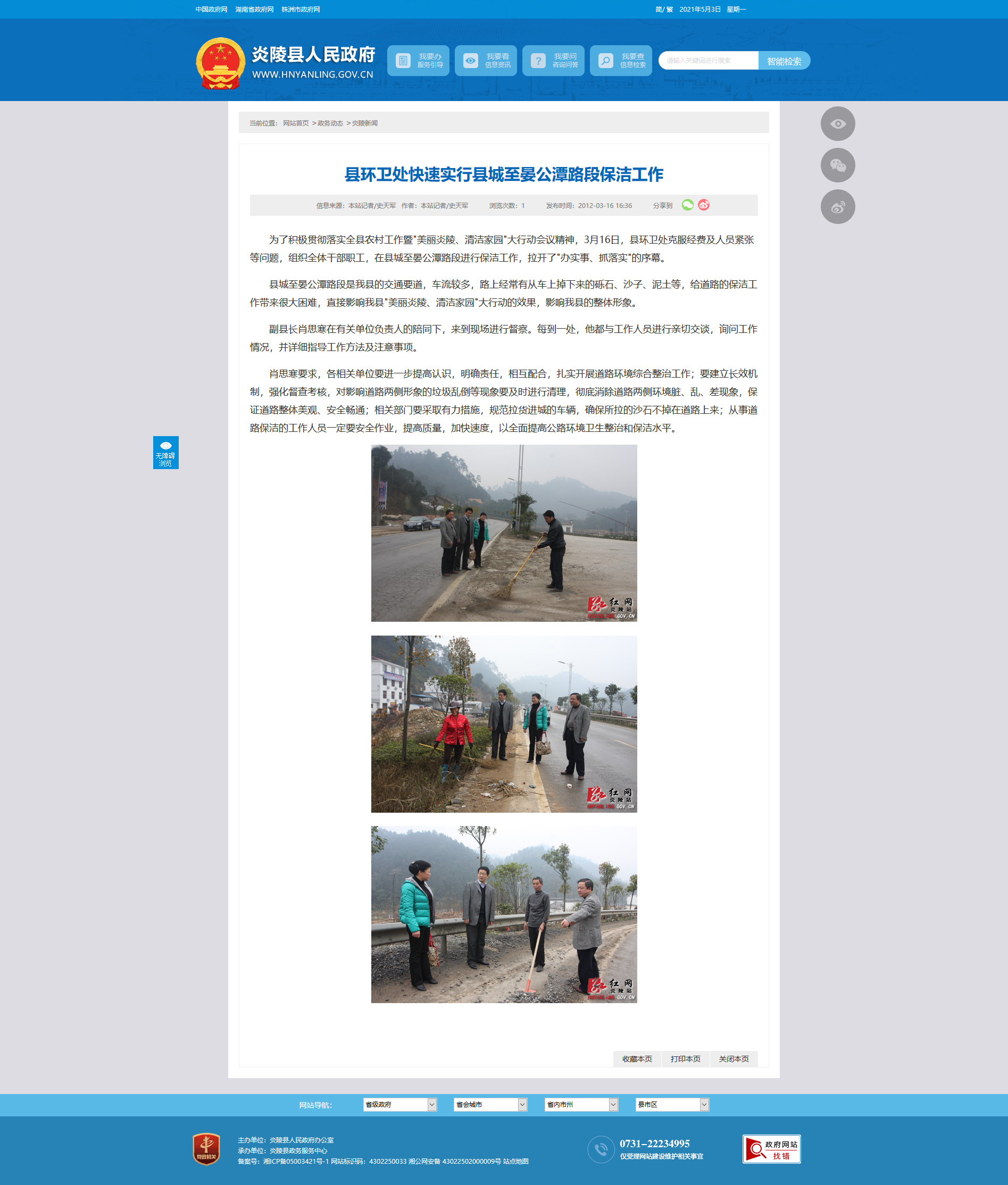 为了积极贯彻落实全县农村工作暨"美丽炎陵、清洁家园"大行动会议精神,3月16日,县环卫处克服经费及人员紧张等问题,组织全体干部职工,在县城至晏公潭路段进行保洁工作,拉开了"办实事、抓落实"的序幕。