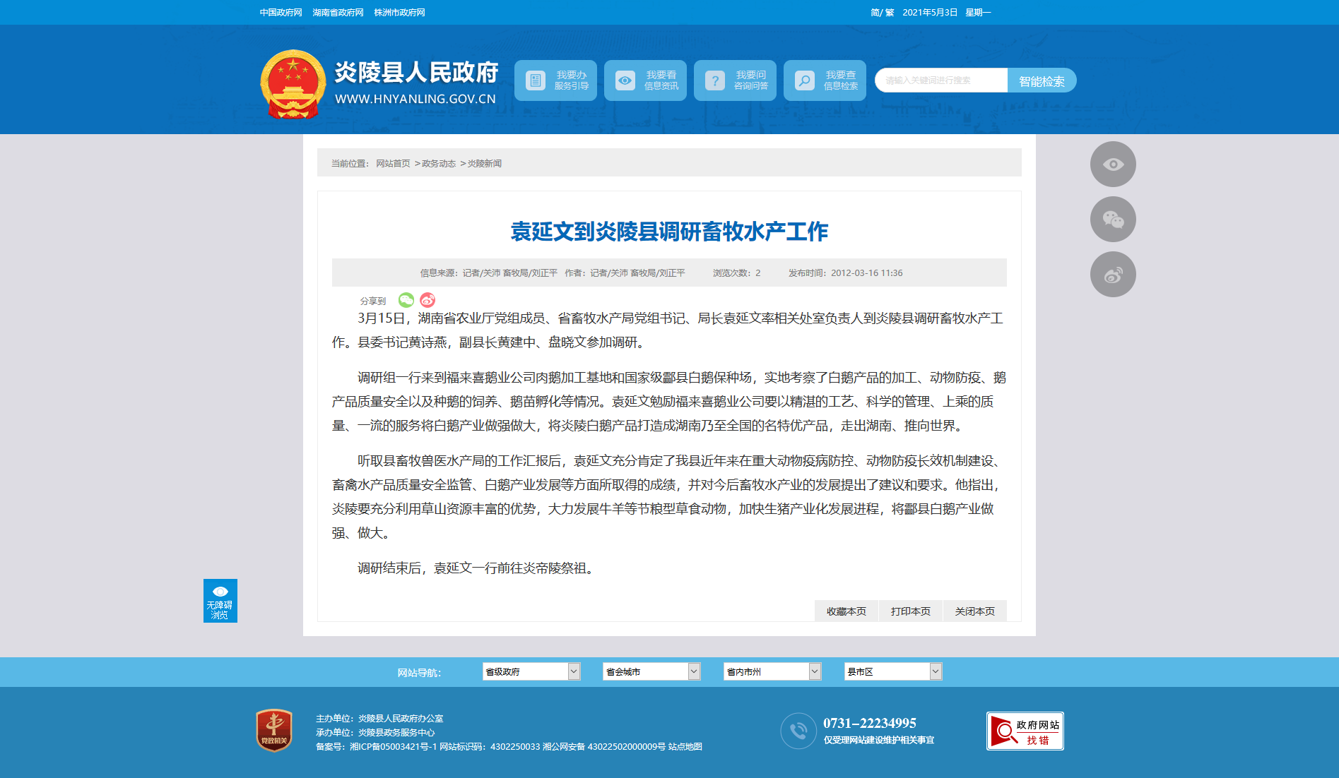 调研组一行来到福来喜鹅业公司肉鹅加工基地和国家级酃县白鹅保种场,实地考察了白鹅产品的加工、动物防疫、鹅产品质量安全以及种鹅的饲养、鹅苗孵化等情况。袁延文勉励福来喜鹅业公司要以精湛的工艺、科学的管理、上乘的质量、一流的服务将白鹅产业做强做大,将炎陵白鹅产品打造成湖南乃至全国的名特优产品,走出湖南、推向世界。