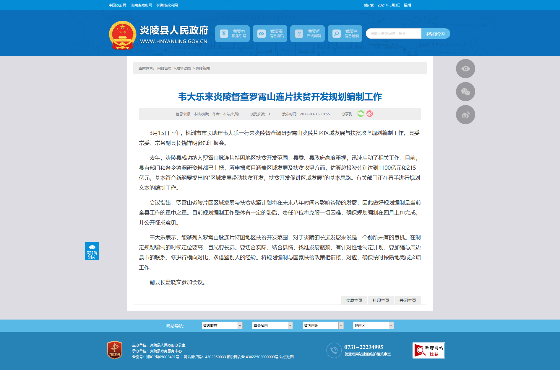 3月15日下午,株洲市市长助理韦大乐一行来炎陵督查调研罗霄山炎陵片区区域发展与扶贫攻坚规划编制工作。县委常委、常务副县长饶祥明参加汇报会。