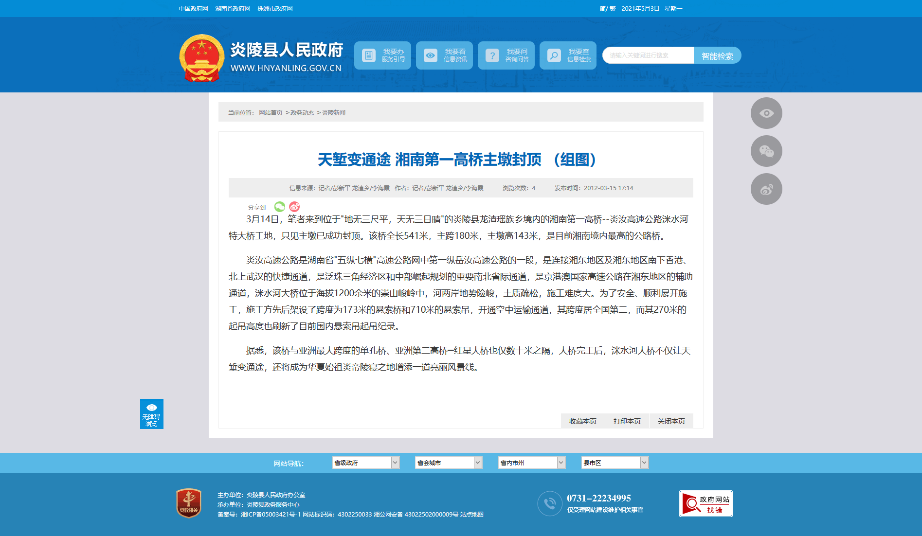 据悉,该桥与亚洲最大跨度的单孔桥、亚洲第二高桥─红星大桥也仅数十米之隔,大桥完工后,洣水河大桥不仅让天堑变通途,还将成为华夏始祖炎帝陵寝之地增添一道亮丽风景线。