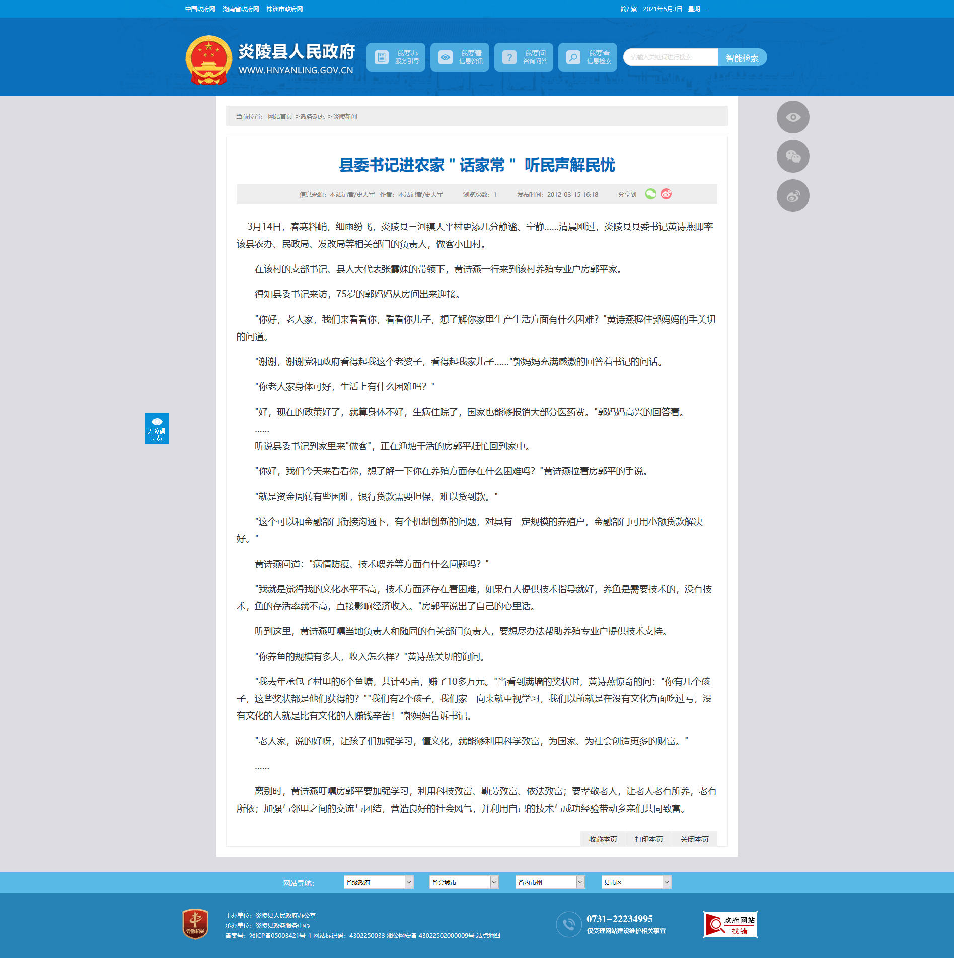 3月14日,春寒料峭,细雨纷飞,炎陵县三河镇天平村更添几分静谧、宁静……清晨刚过,炎陵县县委书记黄诗燕即率该县农办、民政局、发改局等相关部门的负责人,做客小山村。