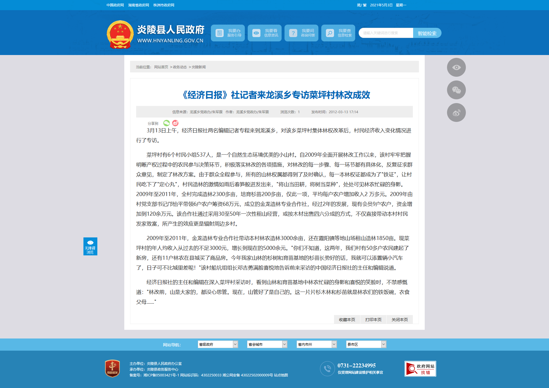 3月13日上午,经济日报社两名编辑记者专程来到龙溪乡,对该乡菜坪村集体林权改革后,村民经济收入变化情况进行了专访。