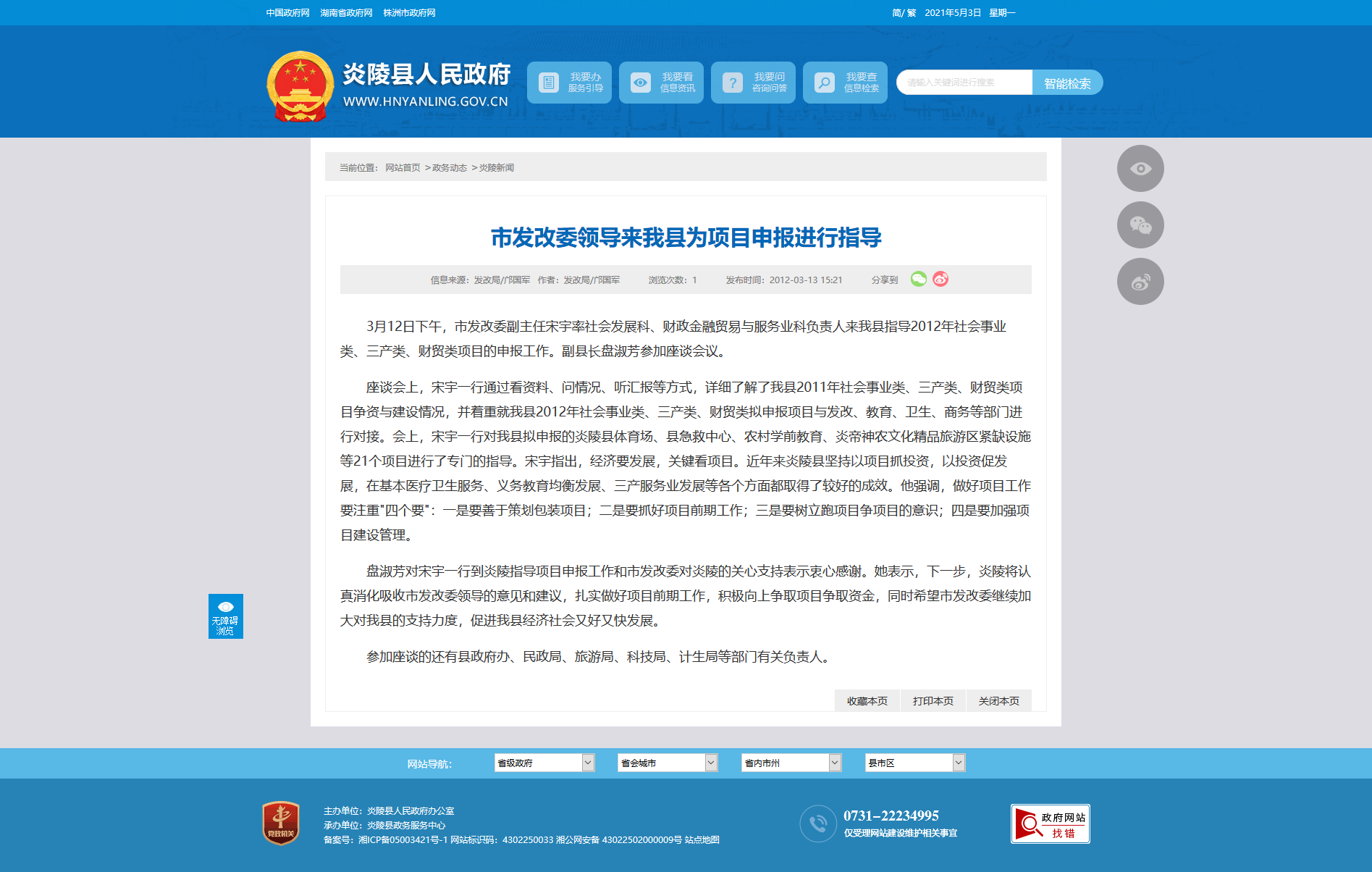 座谈会上,宋宇一行通过看资料、问情况、听汇报等方式,详细了解了我县2011年社会事业类、三产类、财贸类项目争资与建设情况,并着重就我县2012年社会事业类、三产类、财贸类拟申报项目与发改、教育、卫生、商务等部门进行对接。会上,宋宇一行对我县拟申报的炎陵县体育场、县急救中心、农村学前教育、炎帝神农文化精品旅游区紧缺设施等21个项目进行了专门的指导。宋宇指出,经济要发展,关键看项目。近年来炎陵县坚持以项目抓投资,以投资促发展,在基本医疗卫生服务、义务教育均衡发展、三产服务业发展等各个方面都取得了较好的成效。他强调,做好项目工作要注重"四个要":一是要善于策划包装项目;二是要抓好项目前期工作;三是要树立跑项目争项目的意识;四是要加强项目建设管理。
