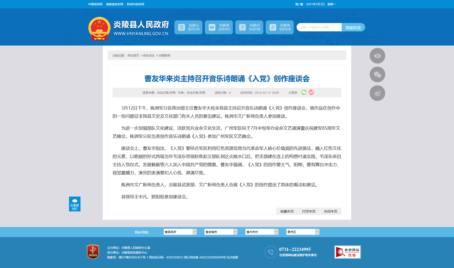 3月12日下午,株洲军分区政治部主任曹友华大校来我县主持召开音乐诗朗诵《入党》创作座谈会,就作品在创作中的一些问题征求我县文史及文化部门有关人员的意见建议。株洲市文广新局负责人参加座谈。