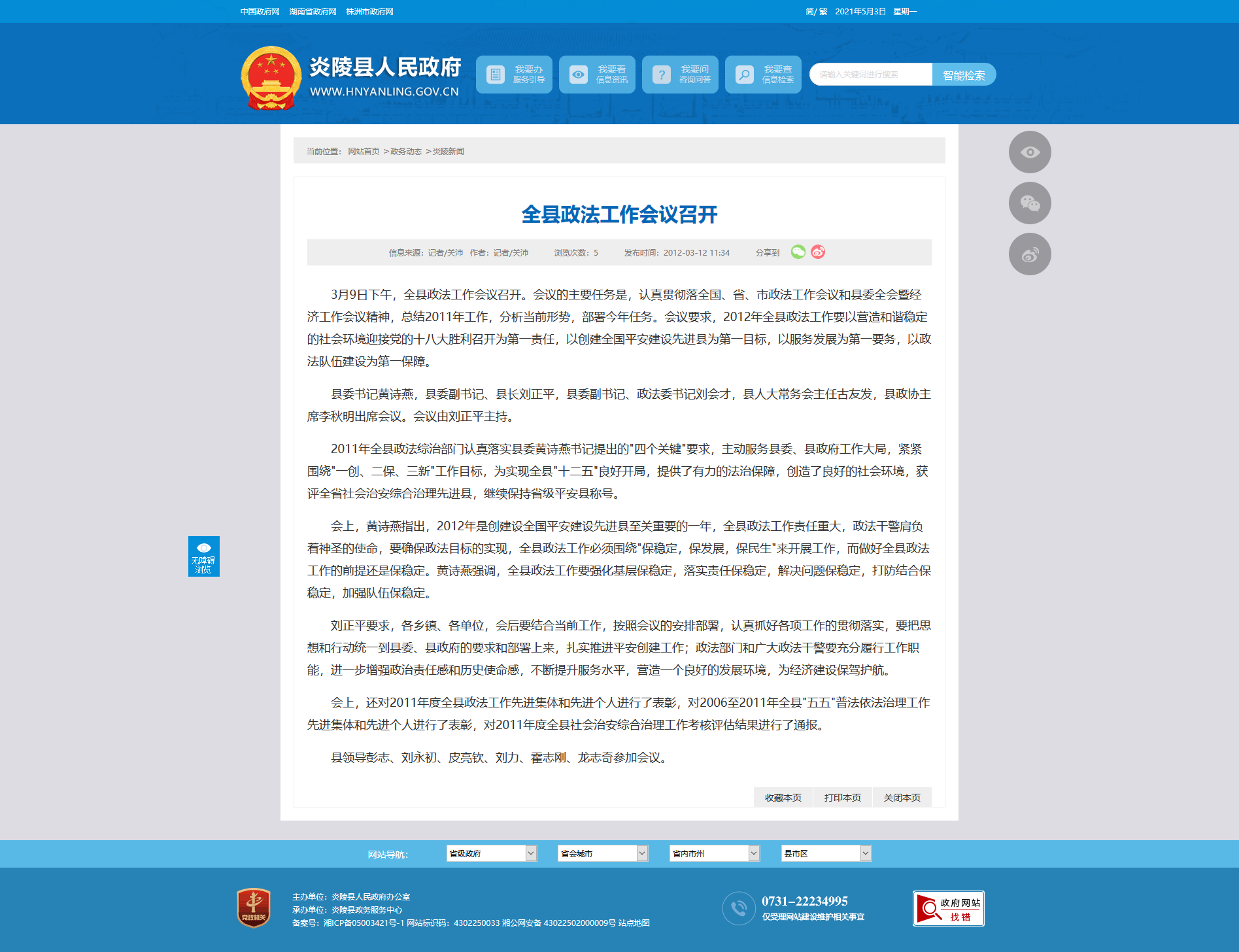 2011年全县政法综治部门认真落实县委黄诗燕书记提出的"四个关键"要求,主动服务县委、县政府工作大局,紧紧围绕"一创、二保、三新"工作目标,为实现全县"十二五"良好开局,提供了有力的法治保障,创造了良好的社会环境,获评全省社会治安综合治理先进县,继续保持省级平安县称号。