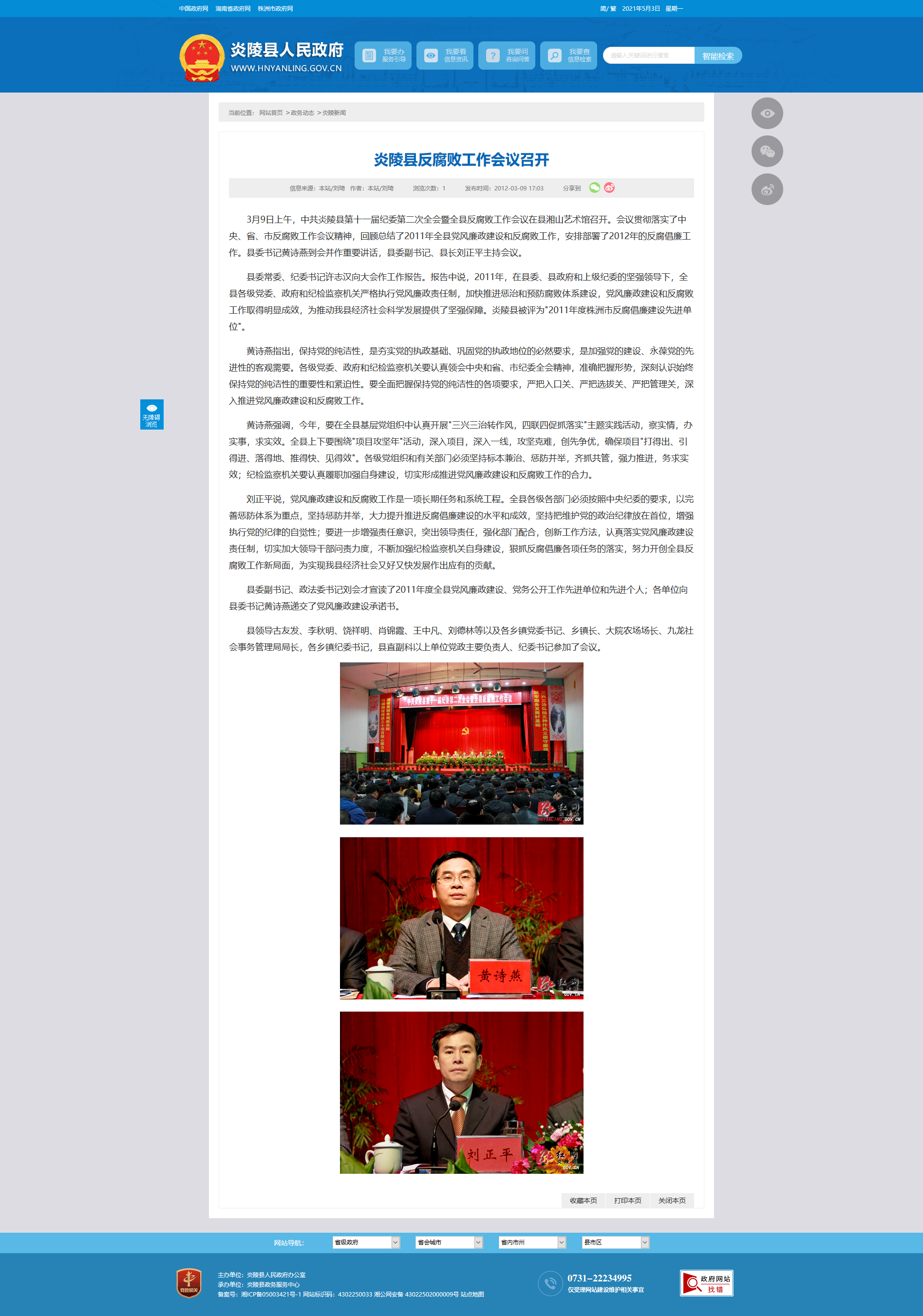 县委常委、纪委书记许志汉向大会作工作报告。报告中说,2011年,在县委、县政府和上级纪委的坚强领导下,全县各级党委、政府和纪检监察机关严格执行党风廉政责任制,加快推进惩治和预防腐败体系建设,党风廉政建设和反腐败工作取得明显成效,为推动我县经济社会科学发展提供了坚强保障。炎陵县被评为"2011年度株洲市反腐倡廉建设先进单位"。