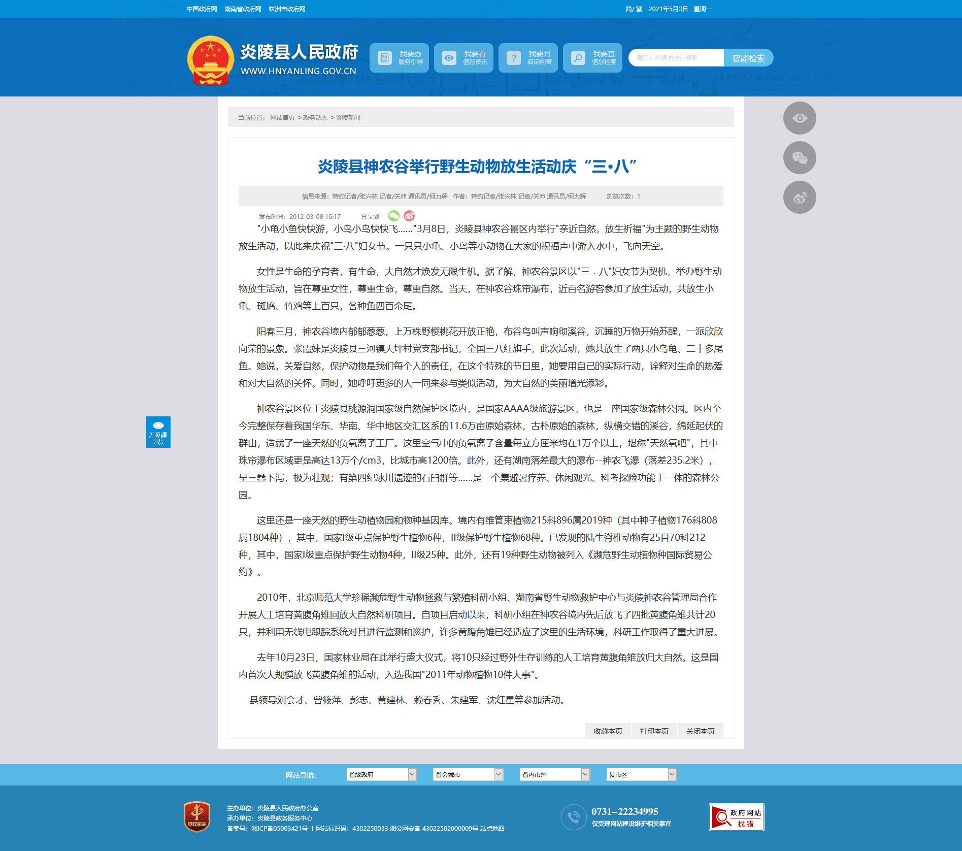 女性是生命的孕育者,有生命,大自然才焕发无限生机。据了解,神农谷景区以"三﹒八"妇女节为契机,举办野生动物放生活动,旨在尊重女性,尊重生命,尊重自然。当天,在神农谷珠帘瀑布,近百名游客参加了放生活动,共放生小龟、斑鸠、竹鸡等上百只,各种鱼四百余尾。