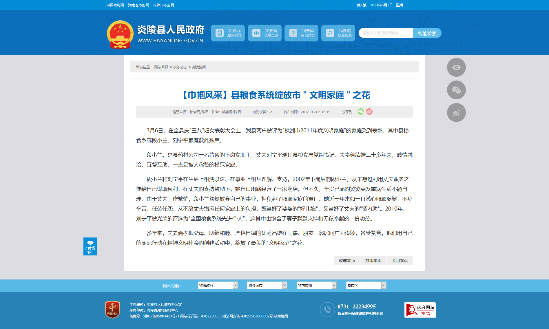 3月6日,在全县庆"三八"妇女表彰大会上,我县两户被评为"株洲市2011年度文明家庭"的家庭受到表彰,其中县粮食系统段小兰、刘宁平家庭获此殊荣。