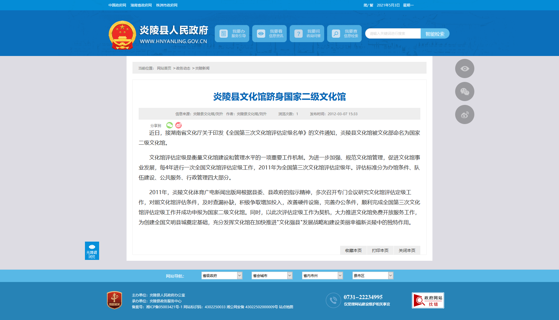 近日,接湖南省文化厅关于印发《全国第三次文化馆评估定级名单》的文件通知,炎陵县文化馆被文化部命名为国家二级文化馆。