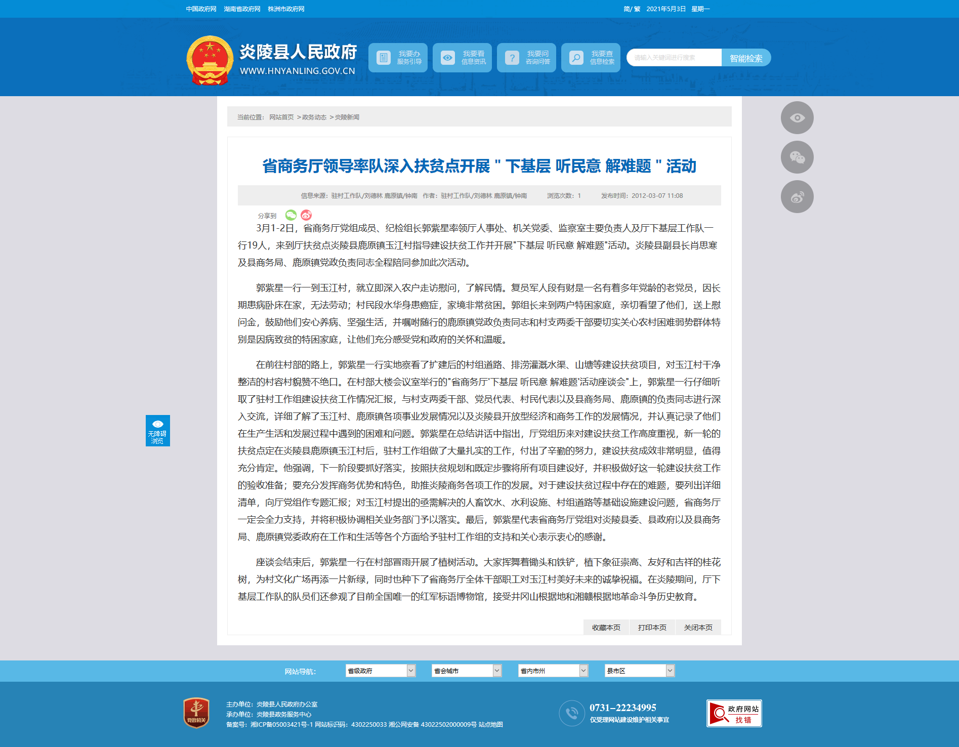 3月1-2日,省商务厅党组成员、纪检组长郭紫星率领厅人事处、机关党委、监察室主要负责人及厅下基层工作队一行19人,来到厅扶贫点炎陵县鹿原镇玉江村指导建设扶贫工作并开展"下基层 听民意 解难题"活动。炎陵县副县长肖思寒及县商务局、鹿原镇党政负责同志全程陪同参加此次活动。