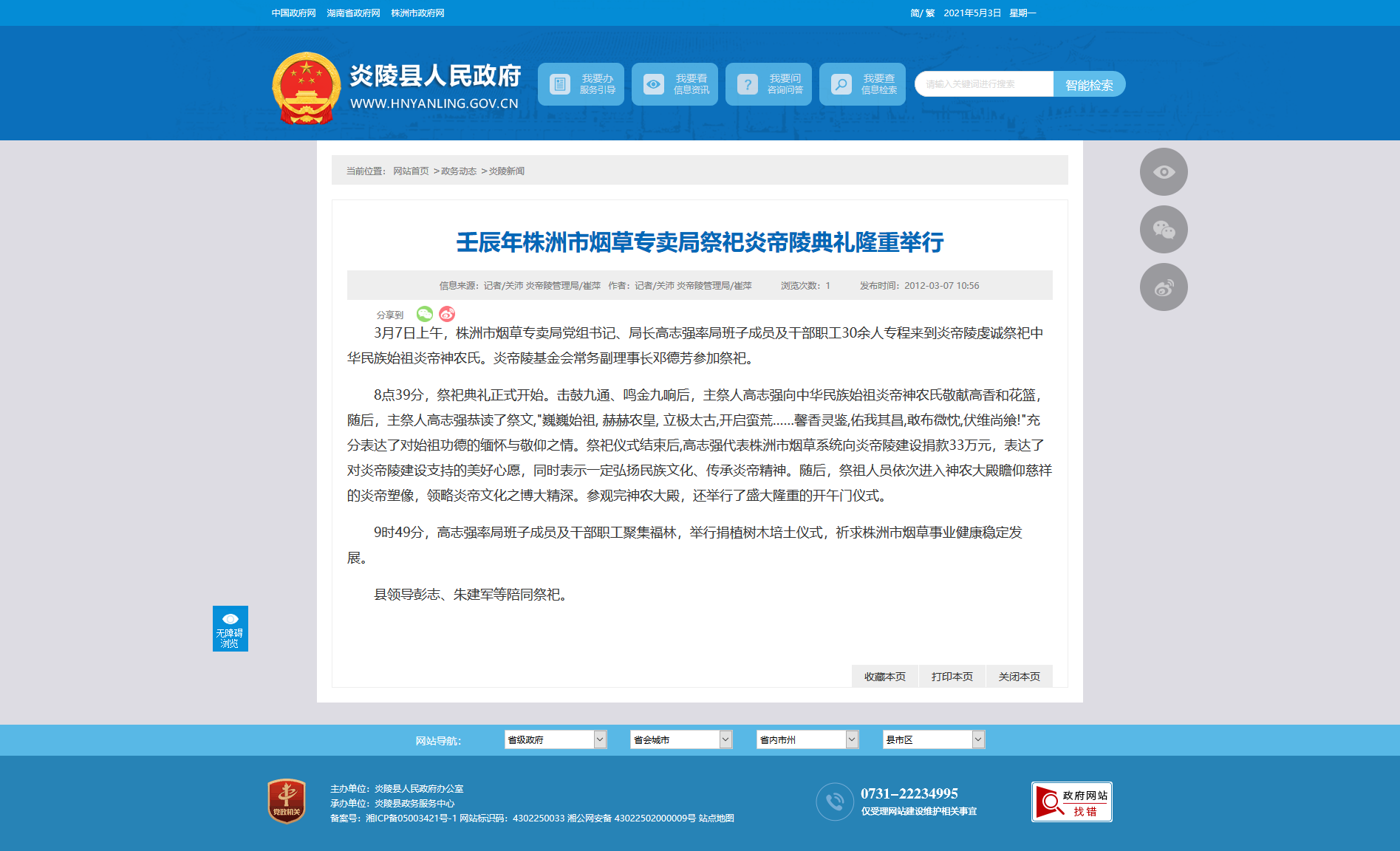 3月7日上午,株洲市烟草专卖局党组书记、局长高志强率局班子成员及干部职工30余人专程来到炎帝陵虔诚祭祀中华民族始祖炎帝神农氏。炎帝陵基金会常务副理事长邓德芳参加祭祀。