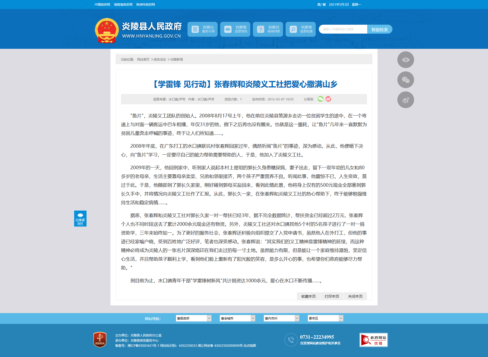 2008年年底,在广东打工的水口镇联坑村张春辉回家过年,偶然听闻"鱼片"的事迹,深为感动。从此,他便暗下决心,向"鱼片"学习,一定要尽自己的能力帮助需要帮助的人,于是,他加入了炎陵义工社。