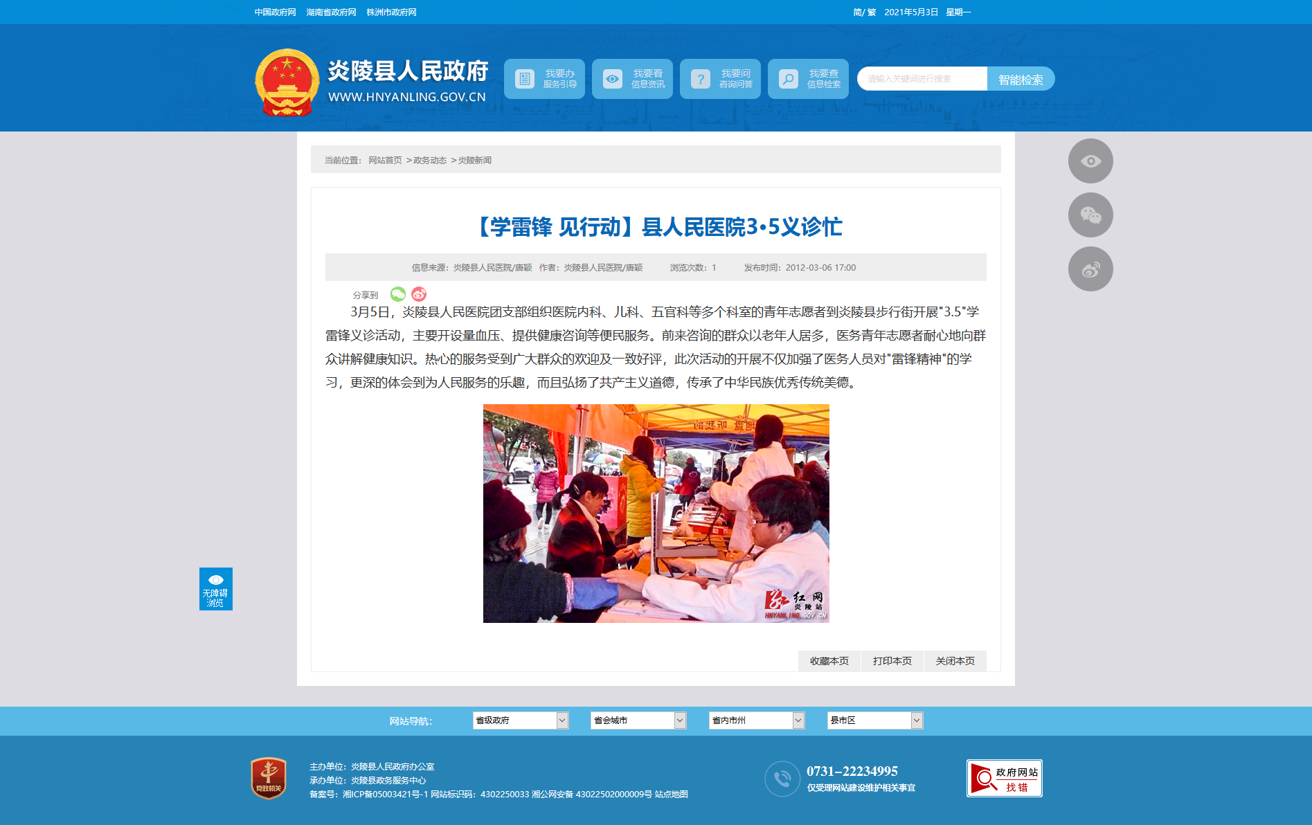 3月5日,炎陵县人民医院团支部组织医院内科、儿科、五官科等多个科室的青年志愿者到炎陵县步行街开展"3.5"学雷锋义诊活动,主要开设量血压、提供健康咨询等便民服务。前来咨询的群众以老年人居多,医务青年志愿者耐心地向群众讲解健康知识。热心的服务受到广大群众的欢迎及一致好评,此次活动的开展不仅加强了医务人员对"雷锋精神"的学习,更深的体会到为人民服务的乐趣,而且弘扬了共产主义道德,传承了中华民族优秀传统美德。