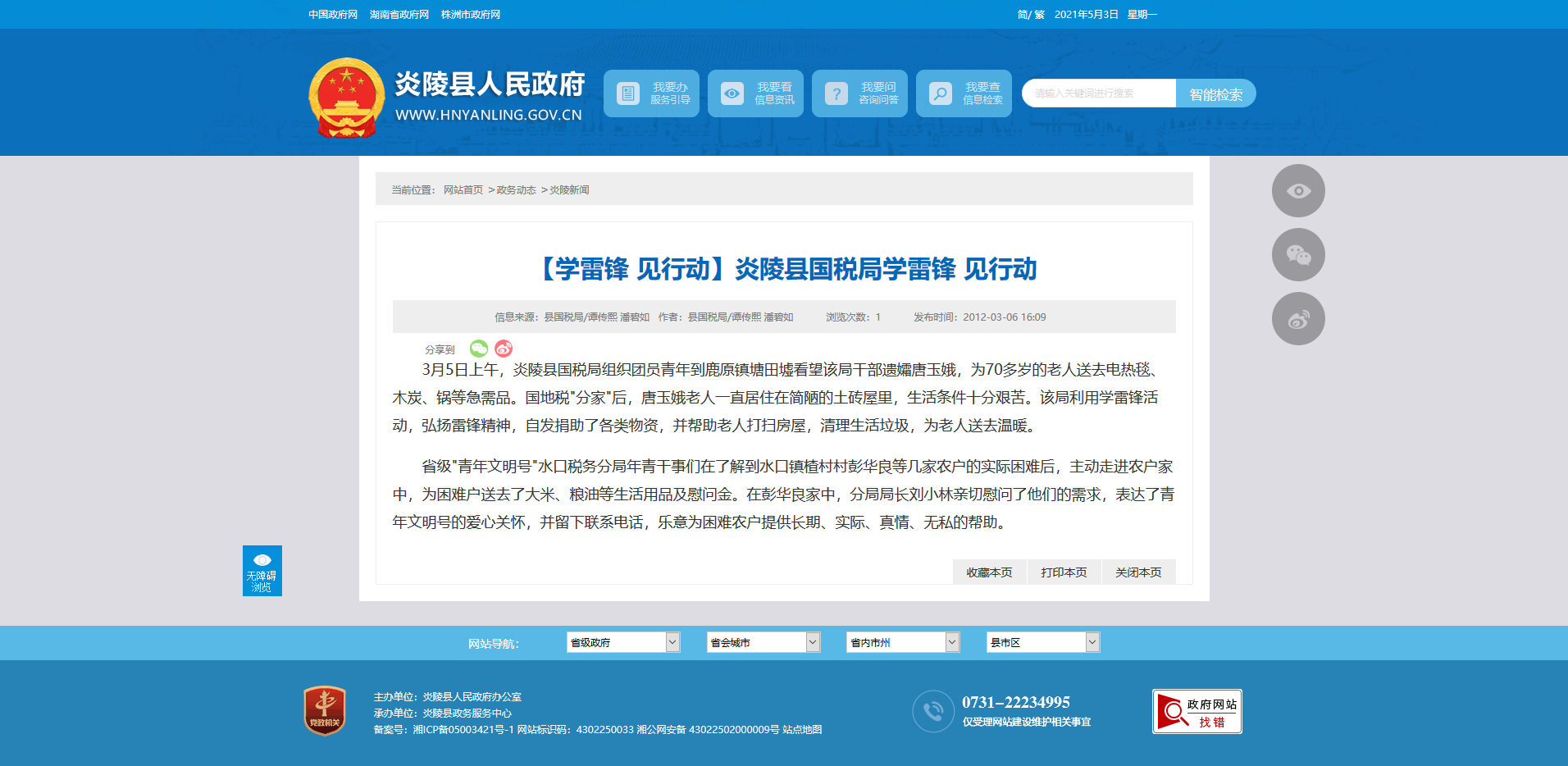 3月5日上午,炎陵县国税局组织团员青年到鹿原镇塘田墟看望该局干部遗孀唐玉娥,为70多岁的老人送去电热毯、木炭、锅等急需品。国地税"分家"后,唐玉娥老人一直居住在简陋的土砖屋里,生活条件十分艰苦。该局利用学雷锋活动,弘扬雷锋精神,自发捐助了各类物资,并帮助老人打扫房屋,清理生活垃圾,为老人送去温暖。