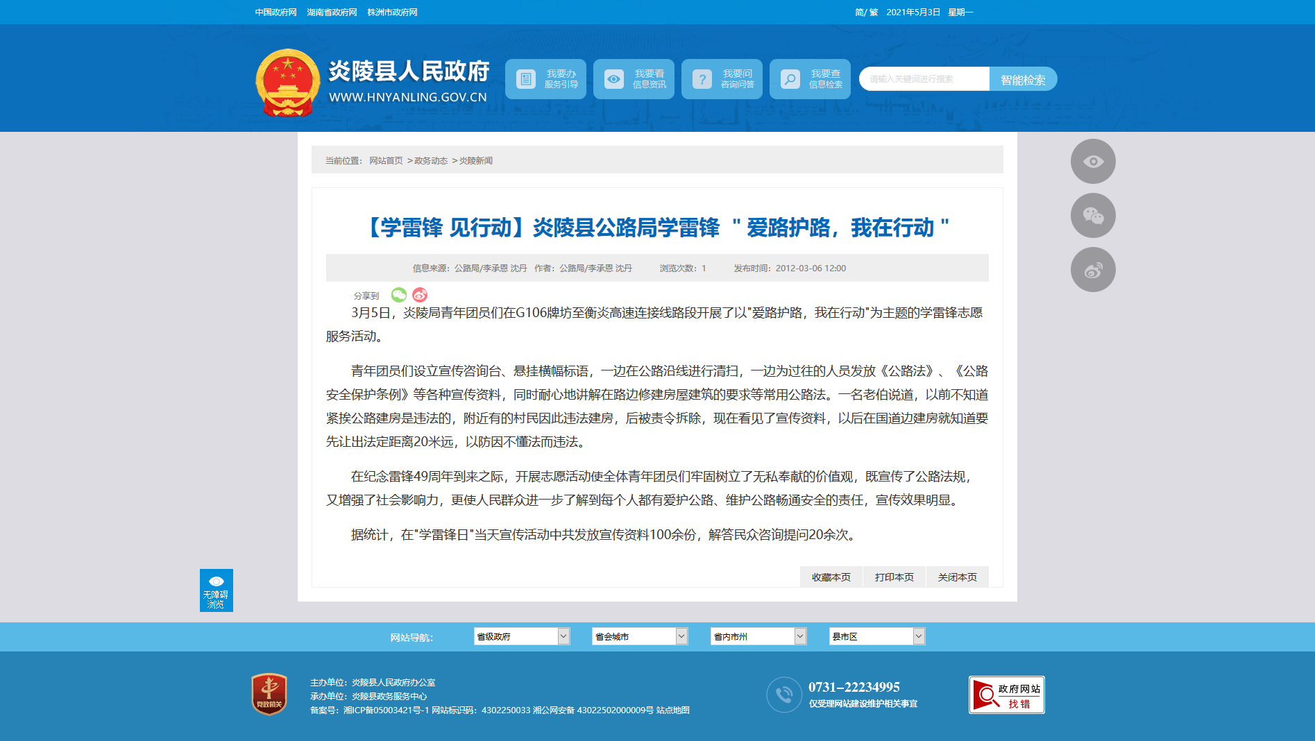 3月5日,炎陵局青年团员们在G106牌坊至衡炎高速连接线路段开展了以"爱路护路,我在行动"为主题的学雷锋志愿服务活动。