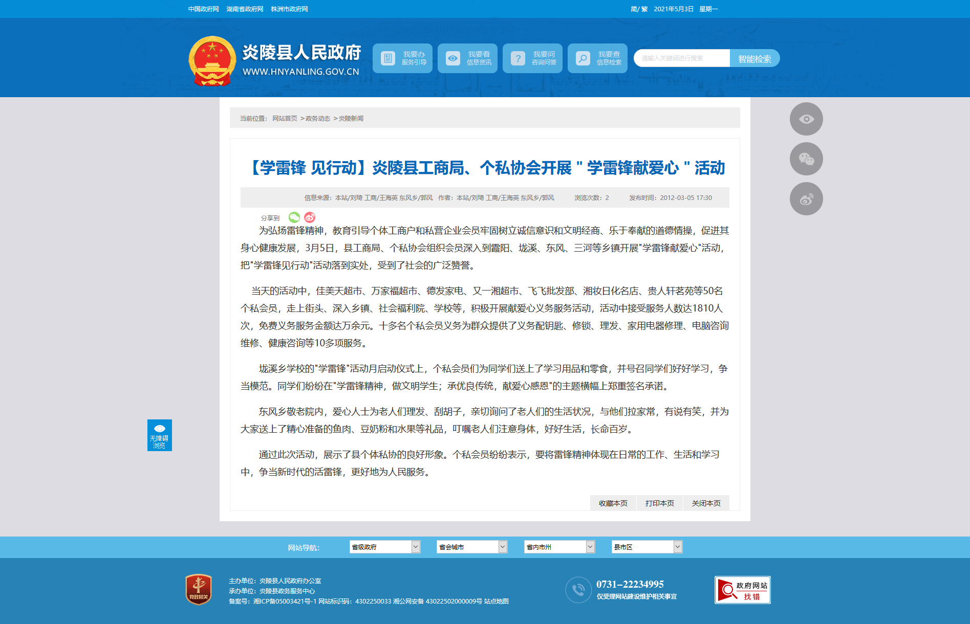 为弘扬雷锋精神,教育引导个体工商户和私营企业会员牢固树立诚信意识和文明经商、乐于奉献的道德情操,促进其身心健康发展,3月5日,县工商局、个私协会组织会员深入到霞阳、垅溪、东风、三河等乡镇开展"学雷锋献爱心"活动,把"学雷锋见行动"活动落到实处,受到了社会的广泛赞誉。