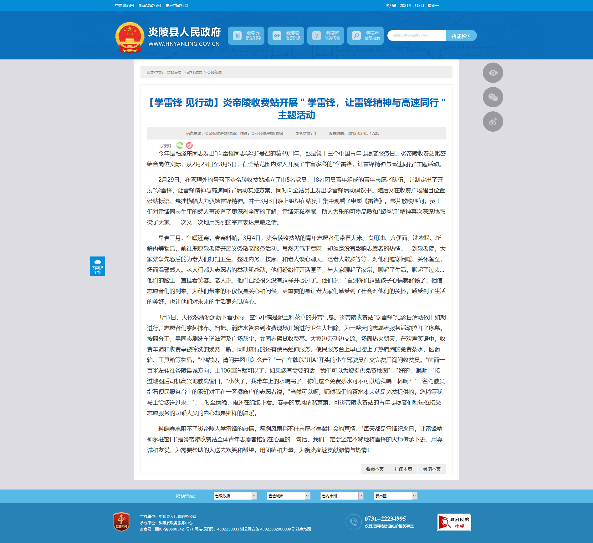 今年是毛泽东同志发出"向雷锋同志学习"号召的第49周年,也是第十三个中国青年志愿者服务日。炎帝陵收费站紧密结合岗位实际,从2月29日至3月5日,在全站范围内深入开展了丰富多彩的"学雷锋,让雷锋精神与高速同行"主题活动。