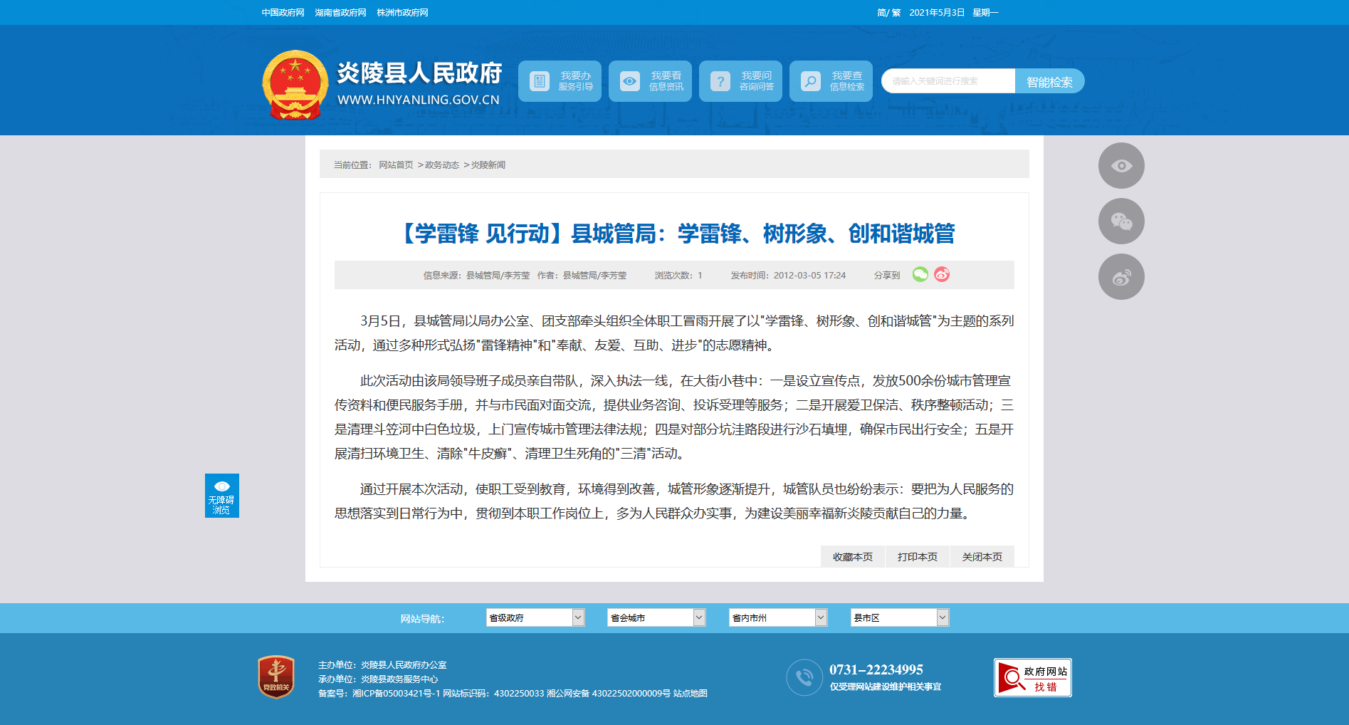 3月5日,县城管局以局办公室、团支部牵头组织全体职工冒雨开展了以"学雷锋、树形象、创和谐城管"为主题的系列活动,通过多种形式弘扬"雷锋精神"和"奉献、友爱、互助、进步"的志愿精神。
