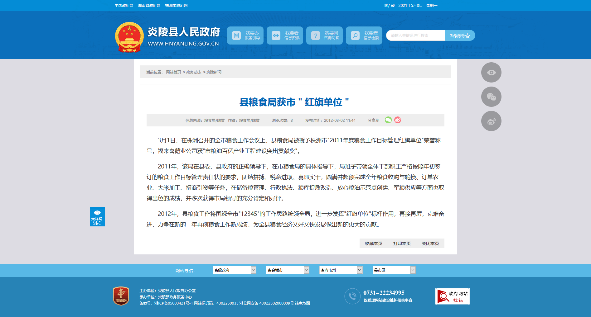 3月1日,在株洲召开的全市粮食工作会议上,县粮食局被授予株洲市"2011年度粮食工作目标管理红旗单位"荣誉称号,福来喜鹅业公司获"市粮油百亿产业工程建设突出贡献奖"。