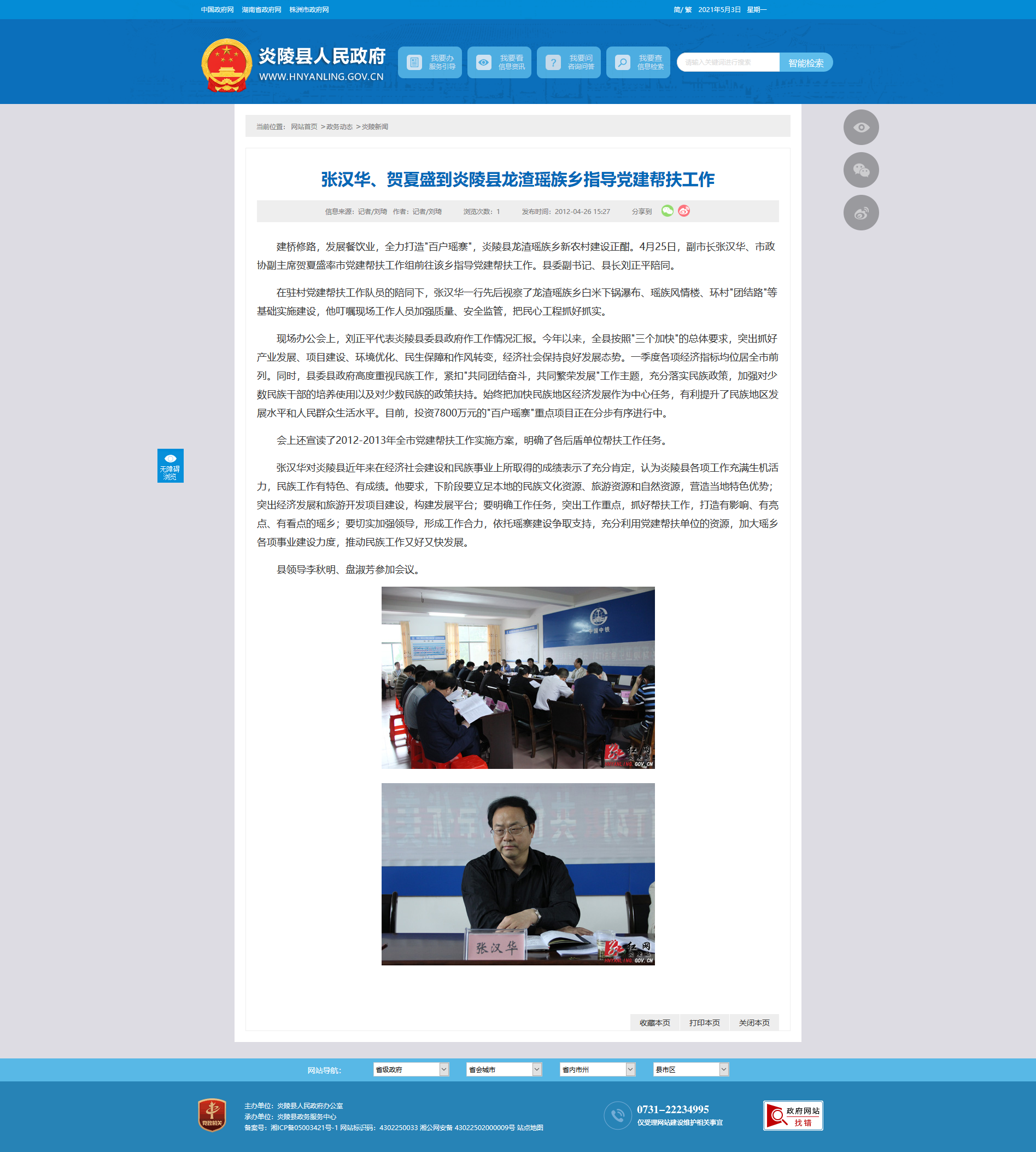 张汉华对炎陵县近年来在经济社会建设和民族事业上所取得的成绩表示了充分肯定,认为炎陵县各项工作充满生机活力,民族工作有特色、有成绩。他要求,下阶段要立足本地的民族文化资源、旅游资源和自然资源,营造当地特色优势;突出经济发展和旅游开发项目建设,构建发展平台;要明确工作任务,突出工作重点,抓好帮扶工作,打造有影响、有亮点、有看点的瑶乡;要切实加强领导,形成工作合力,依托瑶寨建设争取支持,充分利用党建帮扶单位的资源,加大瑶乡各项事业建设力度,推动民族工作又好又快发展。