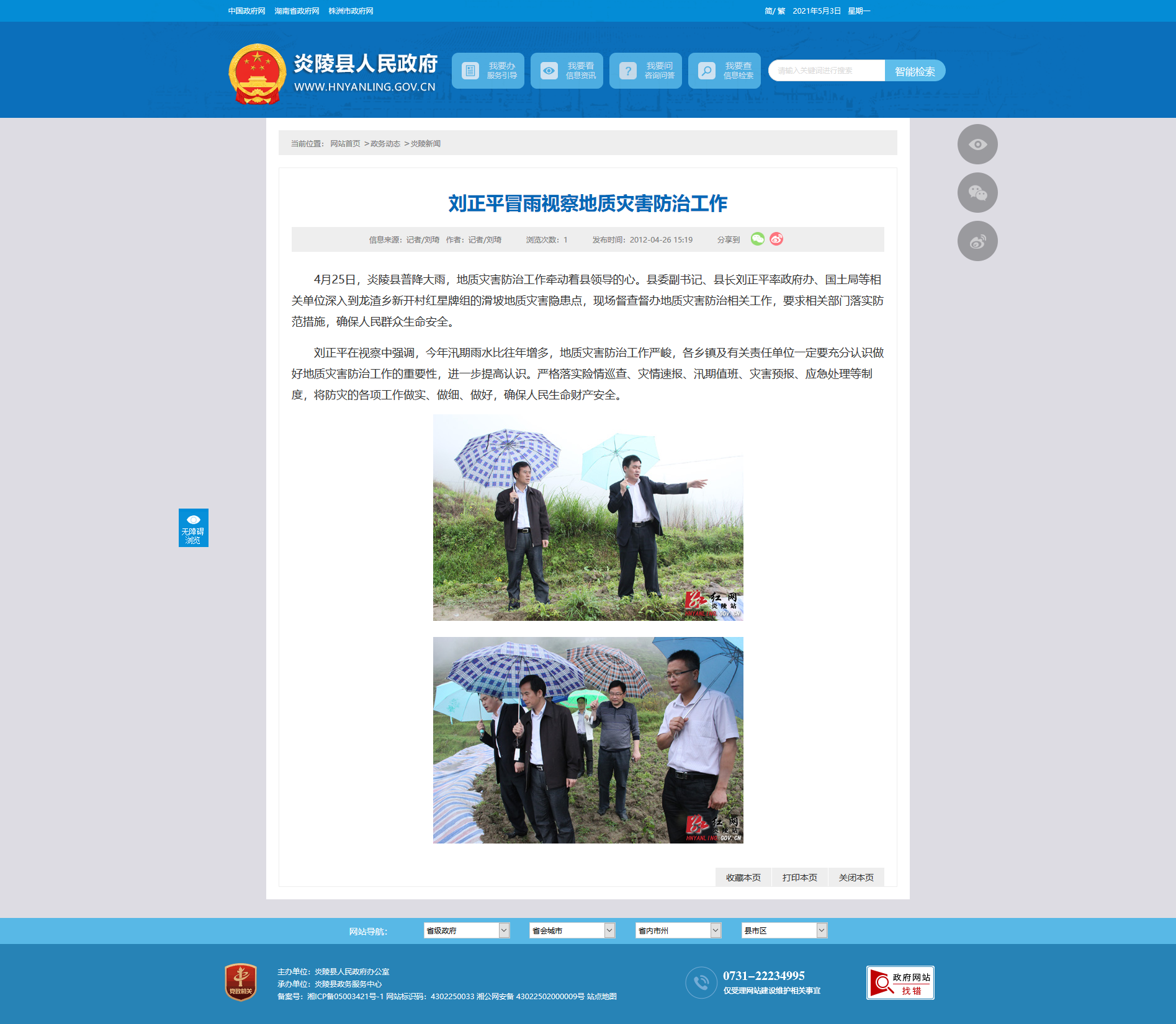 4月25日,炎陵县普降大雨,地质灾害防治工作牵动着县领导的心。县委副书记、县长刘正平率政府办、国土局等相关单位深入到龙渣乡新开村红星牌组的滑坡地质灾害隐患点,现场督查督办地质灾害防治相关工作,要求相关部门落实防范措施,确保人民群众生命安全。