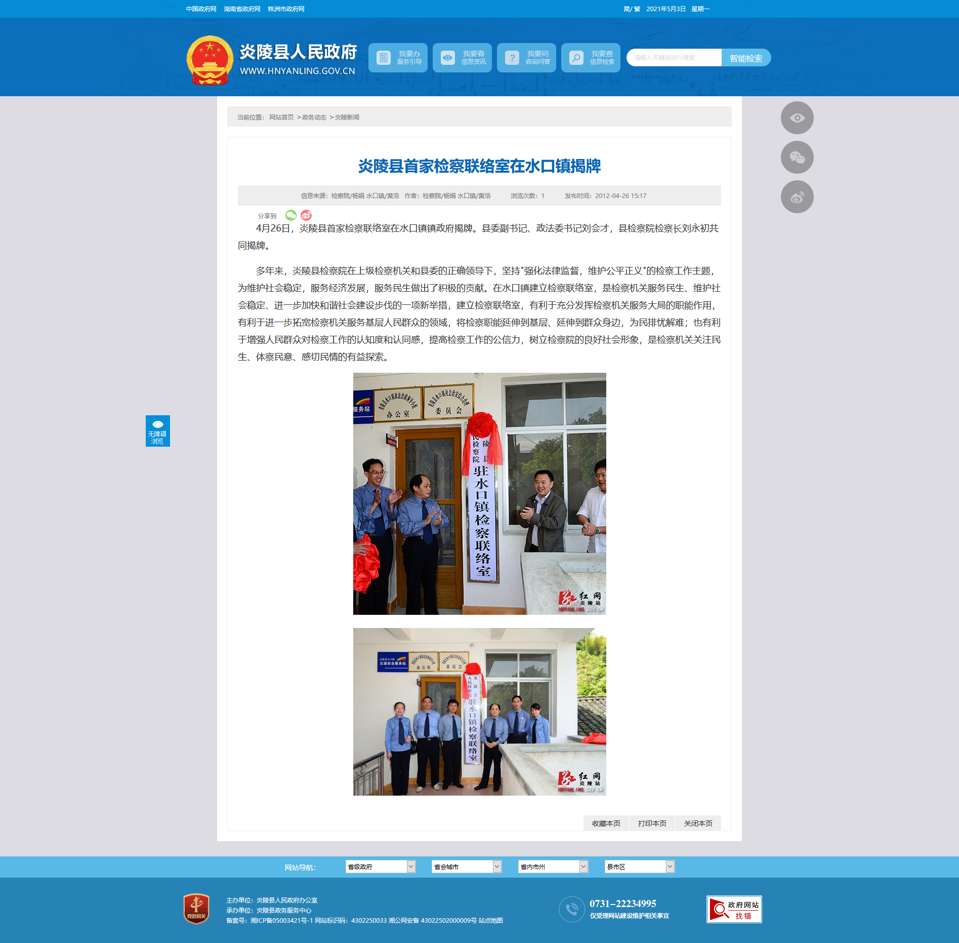 4月26日,炎陵县首家检察联络室在水口镇镇政府揭牌。县委副书记、政法委书记刘会才,县检察院检察长刘永初共同揭牌。