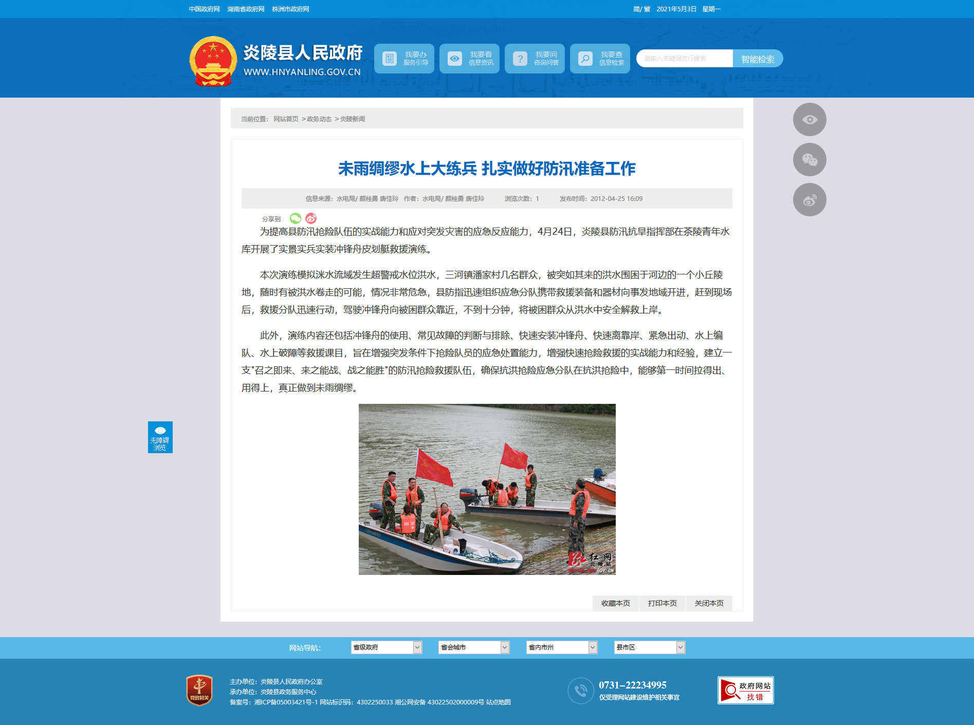 为提高县防汛抢险队伍的实战能力和应对突发灾害的应急反应能力,4月24日,炎陵县防汛抗旱指挥部在茶陵青年水库开展了实景实兵实装冲锋舟皮划艇救援演练。