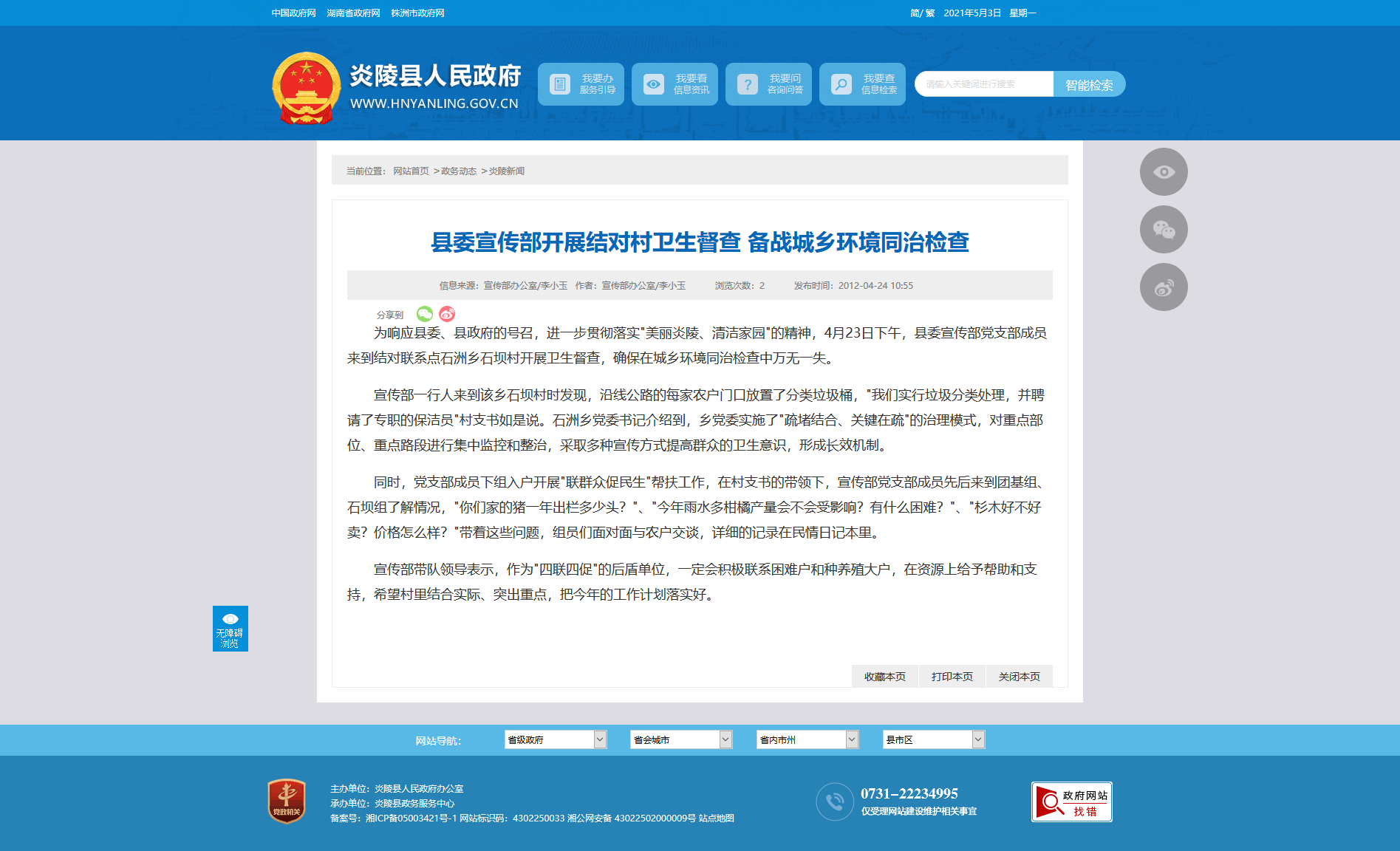 为响应县委、县政府的号召,进一步贯彻落实"美丽炎陵、清洁家园"的精神,4月23日下午,县委宣传部党支部成员来到结对联系点石洲乡石坝村开展卫生督查,确保在城乡环境同治检查中万无一失。