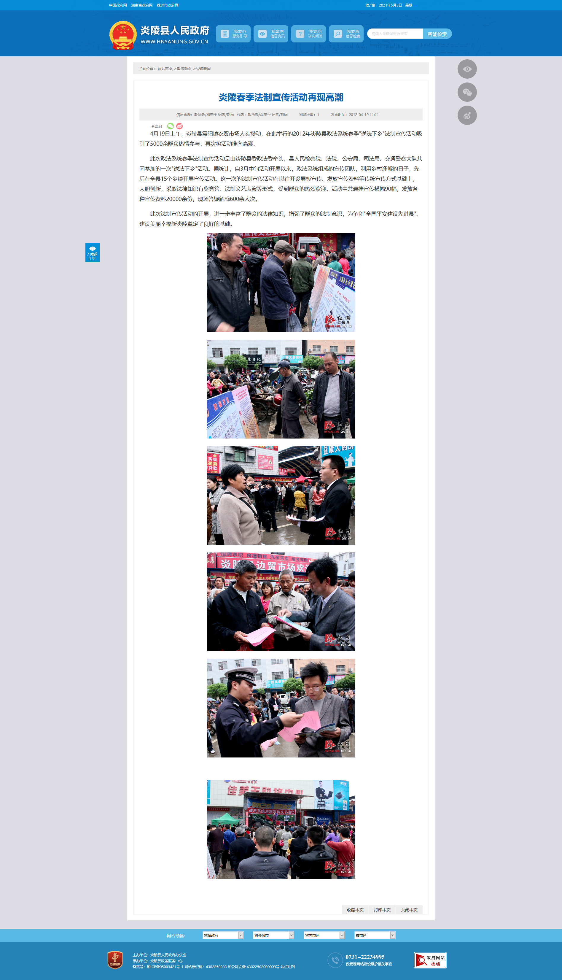4月19日上午,炎陵县霞阳镇农贸市场人头攒动,在此举行的2012年炎陵县政法系统春季"送法下乡"法制宣传活动吸引了5000余群众热情参与,再次将活动推向高潮。
