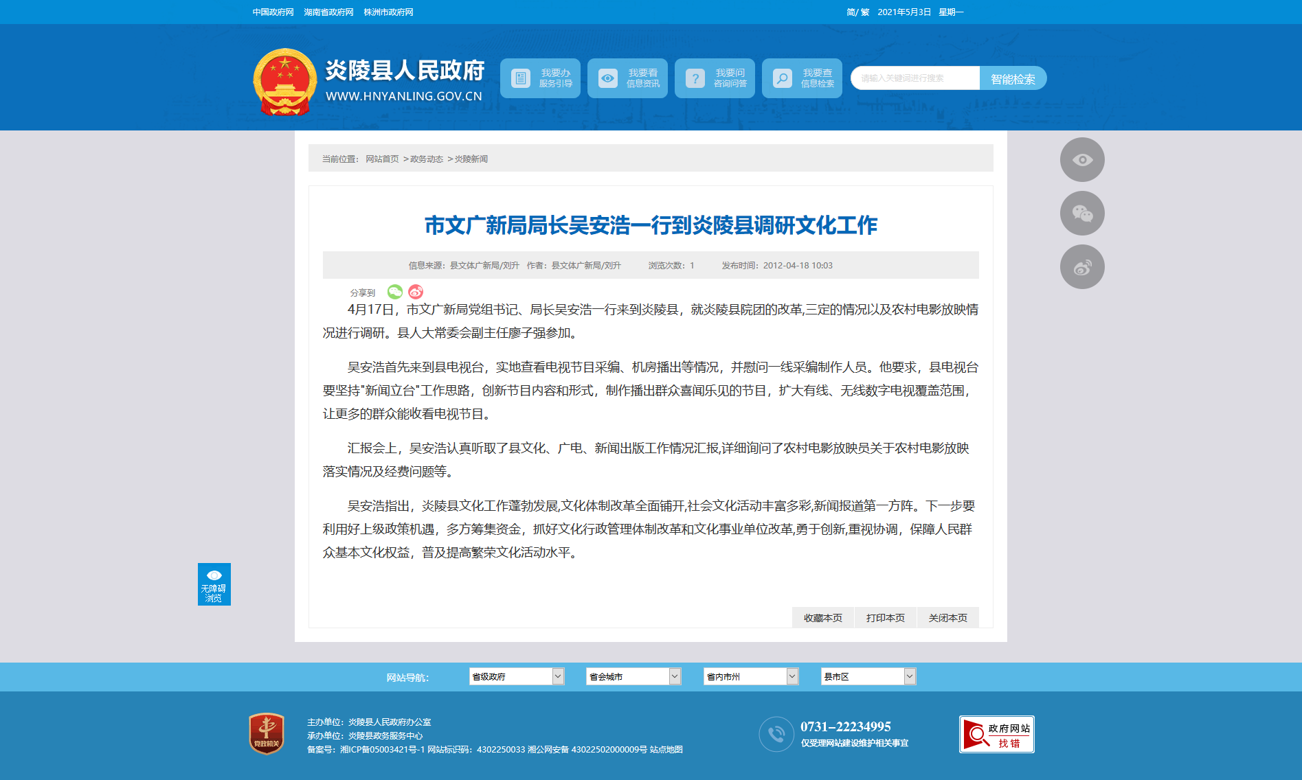 4月17日,市文广新局党组书记、局长吴安浩一行来到炎陵县,就炎陵县院团的改革,三定的情况以及农村电影放映情况进行调研。县人大常委会副主任廖子强参加。
