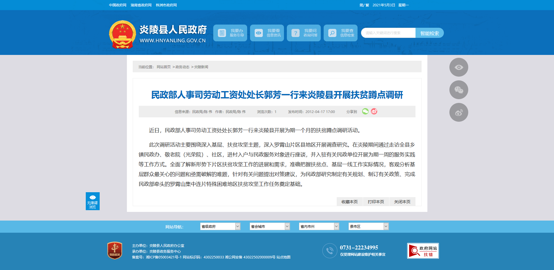 近日,民政部人事司劳动工资处处长郭芳一行来炎陵县开展为期一个月的扶贫蹲点调研活动。