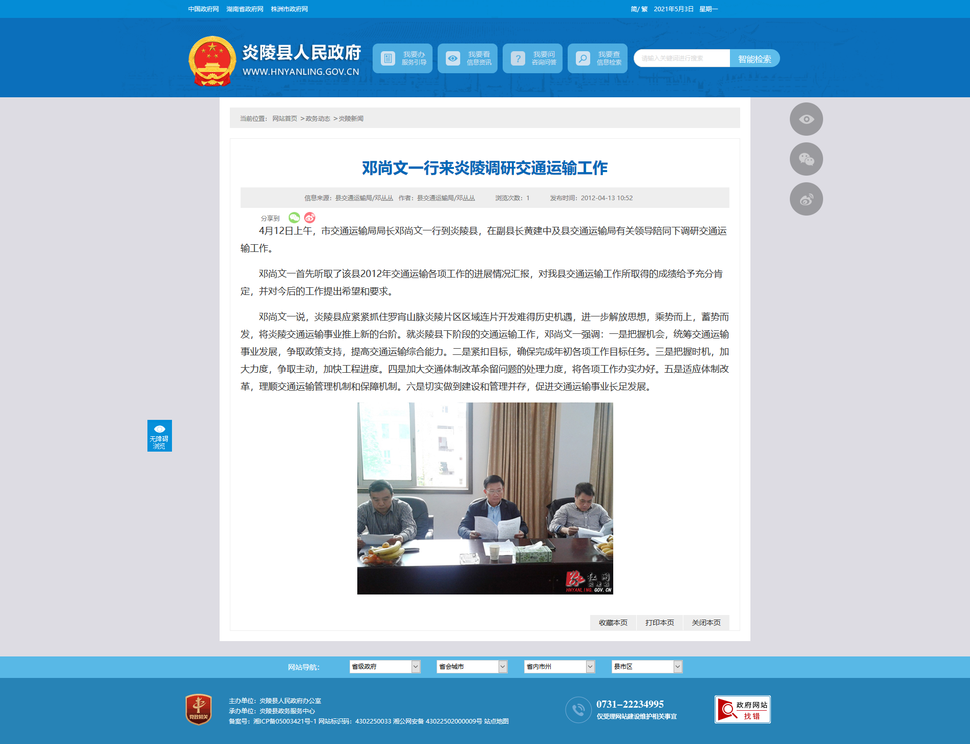 4月12日上午,市交通运输局局长邓尚文一行到炎陵县,在副县长黄建中及县交通运输局有关领导陪同下调研交通运输工作。