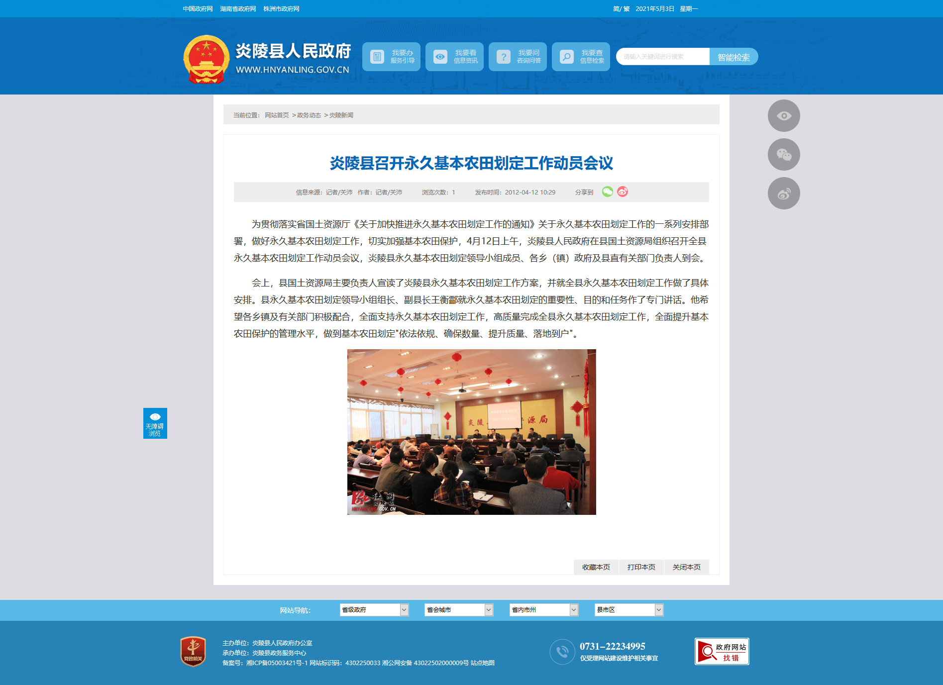 会上,县国土资源局主要负责人宣读了炎陵县永久基本农田划定工作方案,并就全县永久基本农田划定工作做了具体安排。县永久基本农田划定领导小组组长、副县长王衡酃就永久基本农田划定的重要性、目的和任务作了专门讲话。他希望各乡镇及有关部门积极配合,全面支持永久基本农田划定工作,高质量完成全县永久基本农田划定工作,全面提升基本农田保护的管理水平,做到基本农田划定"依法依规、确保数量、提升质量、落地到户"。