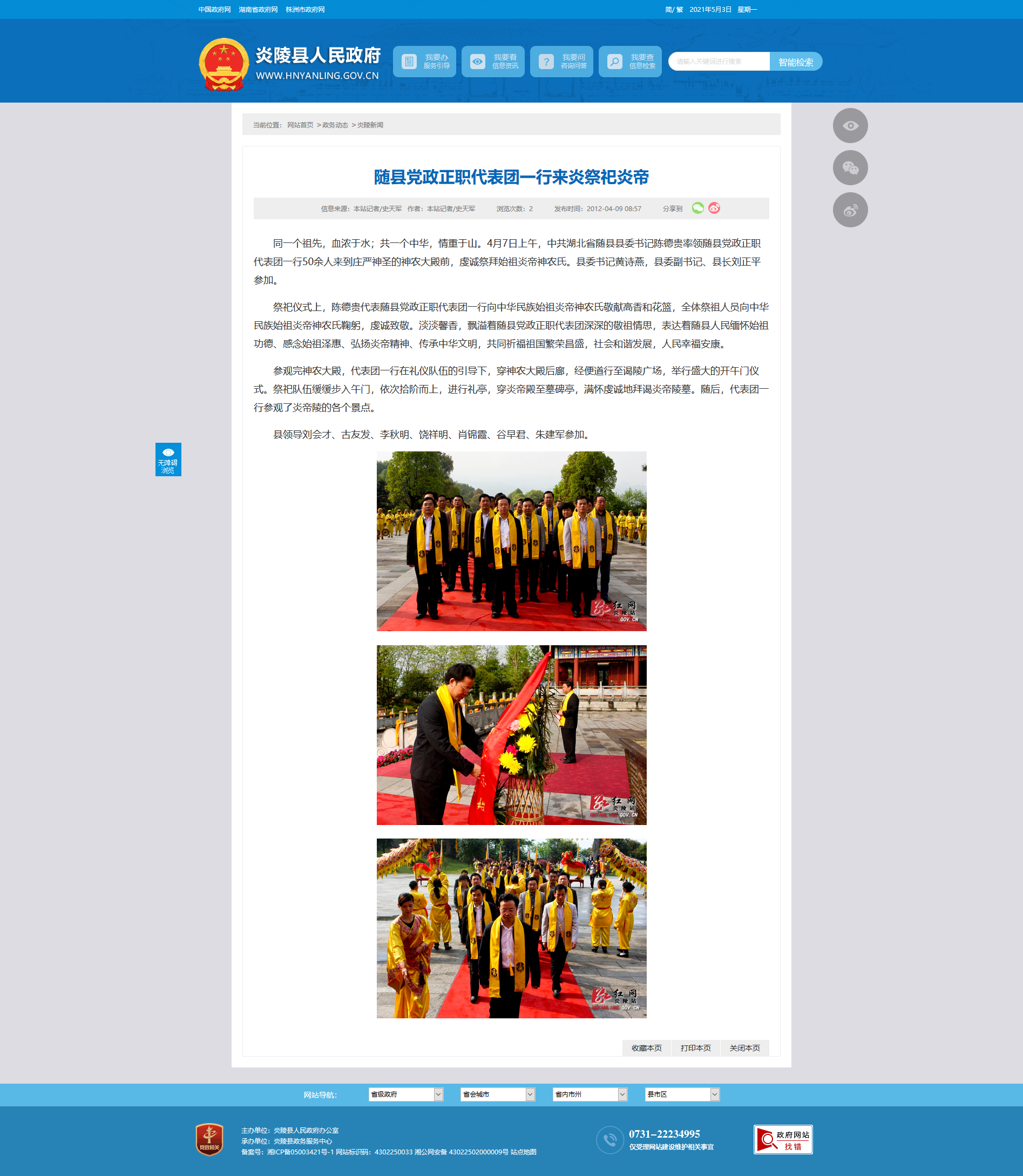 同一个祖先,血浓于水;共一个中华,情重于山。4月7日上午,中共湖北省随县县委书记陈德贵率领随县党政正职代表团一行50余人来到庄严神圣的神农大殿前,虔诚祭拜始祖炎帝神农氏。县委书记黄诗燕,县委副书记、县长刘正平参加。