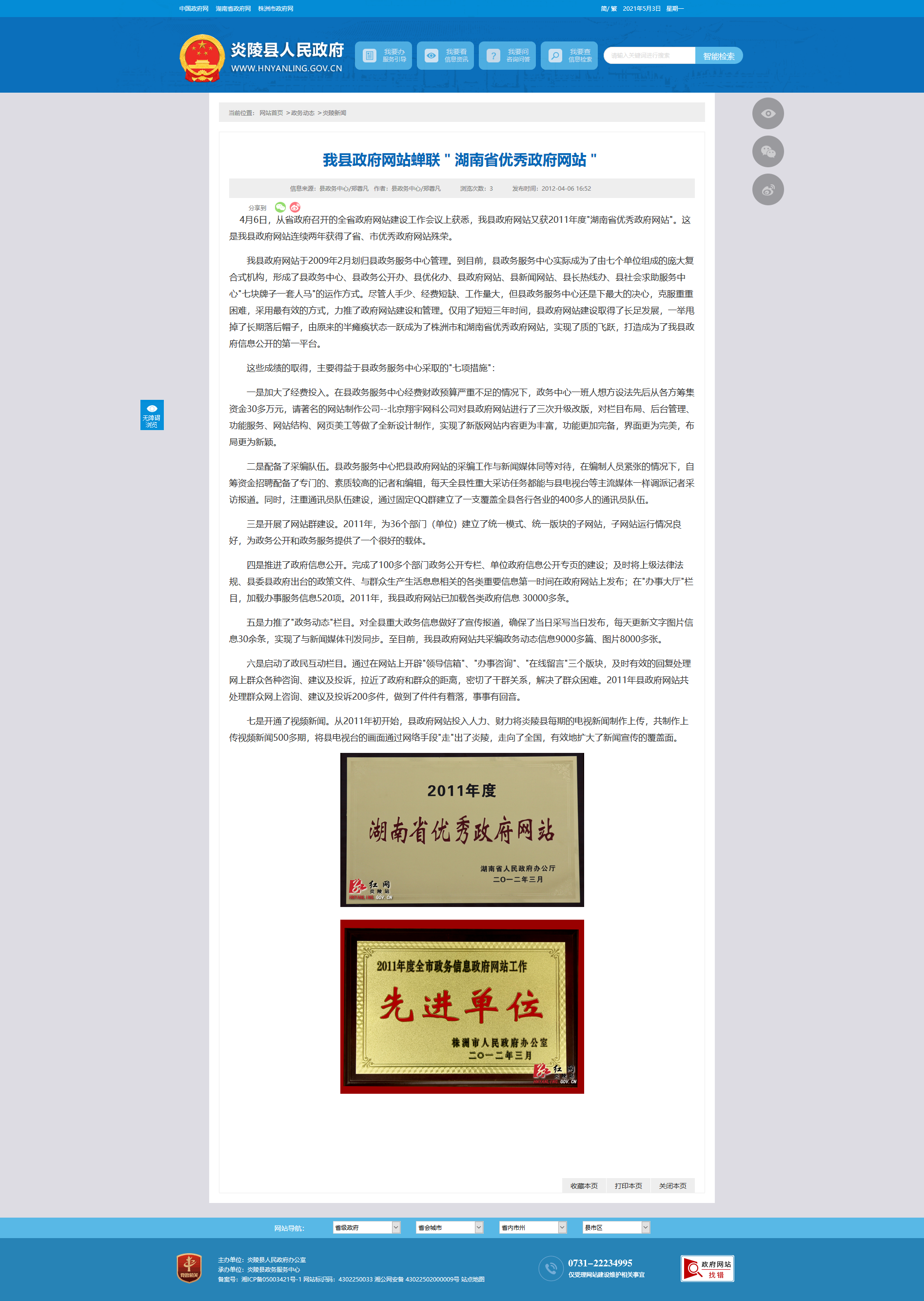 4月6日,从省政府召开的全省政府网站建设工作会议上获悉,我县政府网站又获2011年度"湖南省优秀政府网站"。这是我县政府网站连续两年获得了省、市优秀政府网站殊荣。