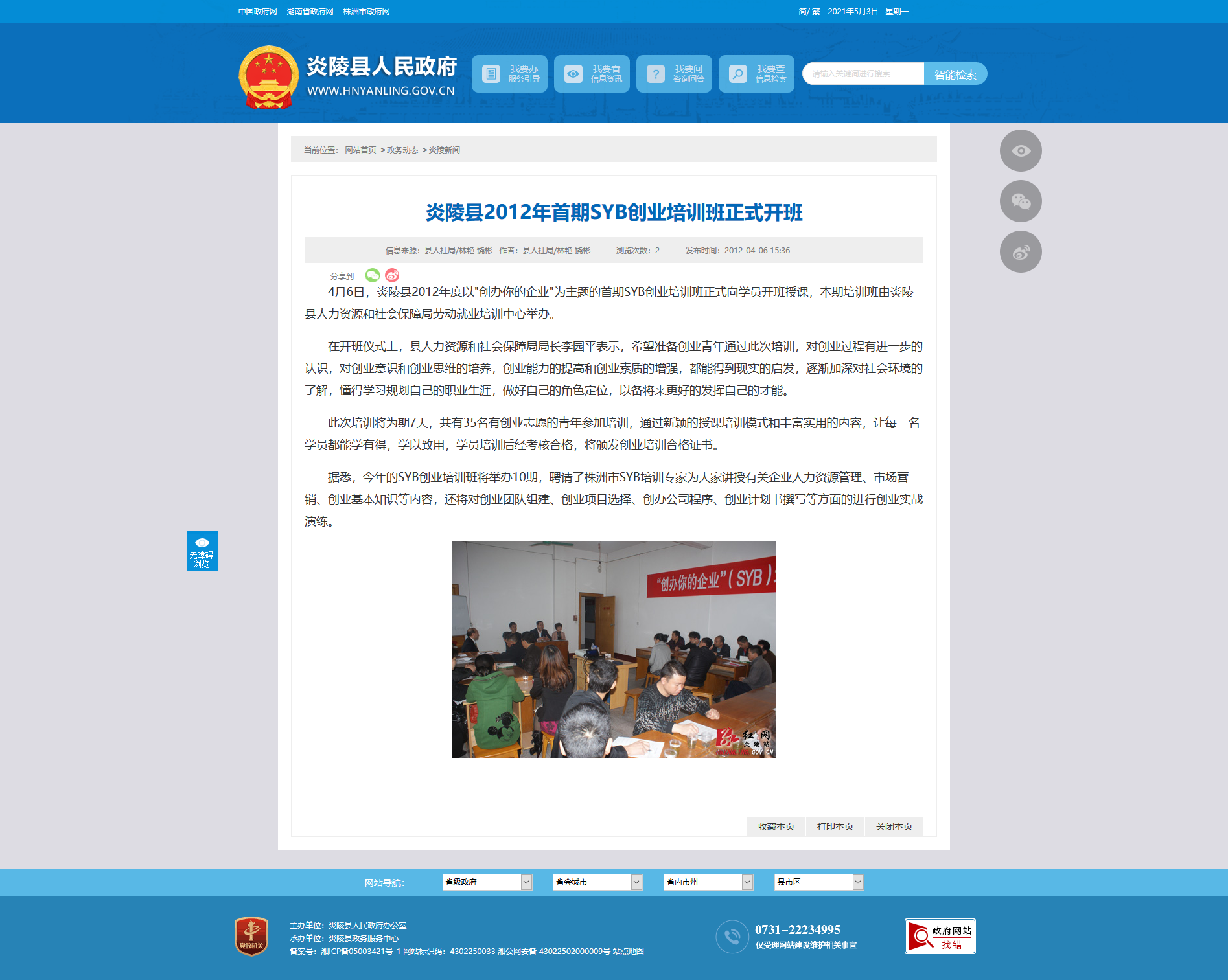 4月6日,炎陵县2012年度以"创办你的企业"为主题的首期SYB创业培训班正式向学员开班授课,本期培训班由炎陵县人力资源和社会保障局劳动就业培训中心举办。