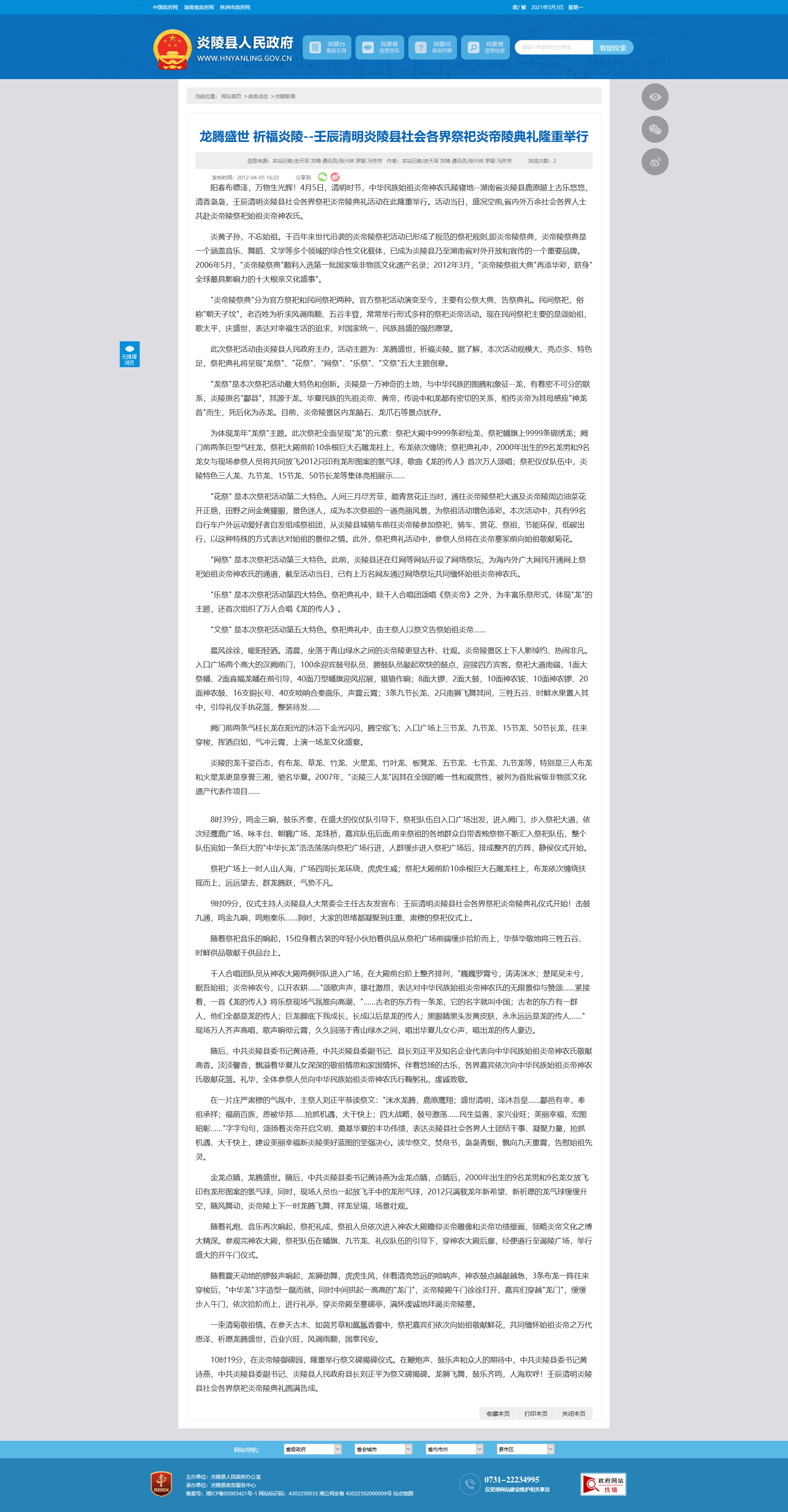 阳春布德泽,万物生光辉!4月5日,清明时节,中华民族始祖炎帝神农氏陵寝地--湖南省炎陵县鹿原陂上古乐悠悠,清香袅袅,壬辰清明炎陵县社会各界祭祀炎帝陵典礼活动在此隆重举行。活动当日,盛况空前,省内外万余社会各界人士共赴炎帝陵祭祀始祖炎帝神农氏。