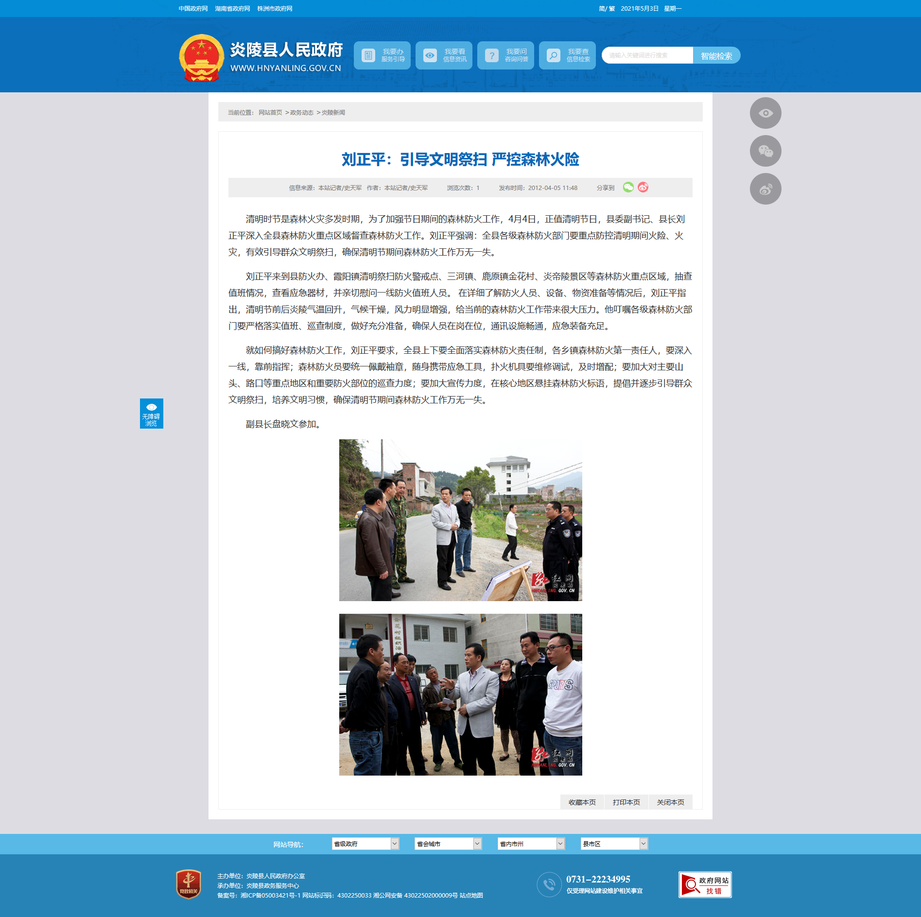 清明时节是森林火灾多发时期,为了加强节日期间的森林防火工作,4月4日,正值清明节日,县委副书记、县长刘正平深入全县森林防火重点区域督查森林防火工作。刘正平强调:全县各级森林防火部门要重点防控清明期间火险、火灾,有效引导群众文明祭扫,确保清明节期间森林防火工作万无一失。